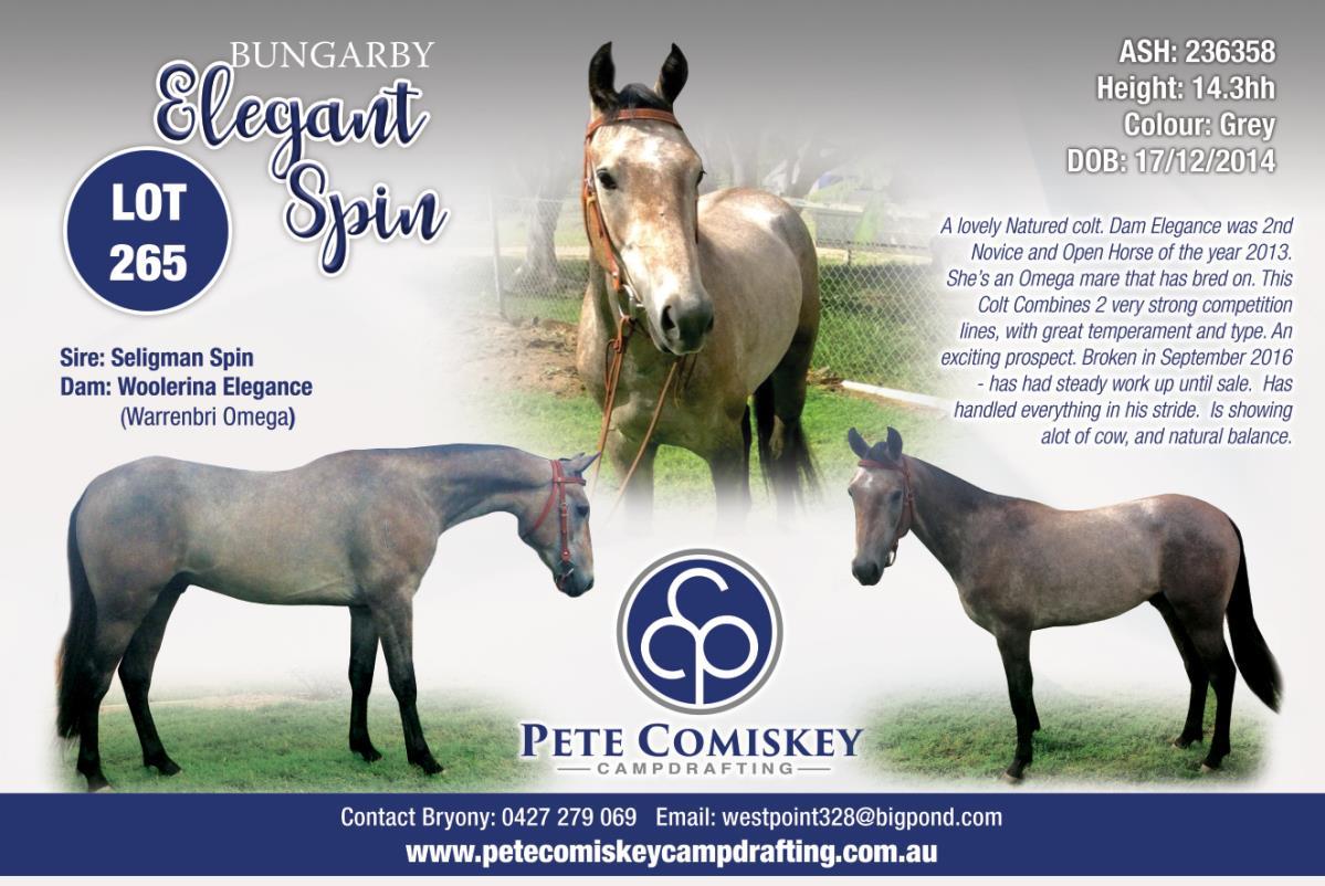 ELEGANT SPIN - broken in September 2016 - has had steady work up until sale. Has handled everything in his stride. Is showing alot of cow, and natural balance.