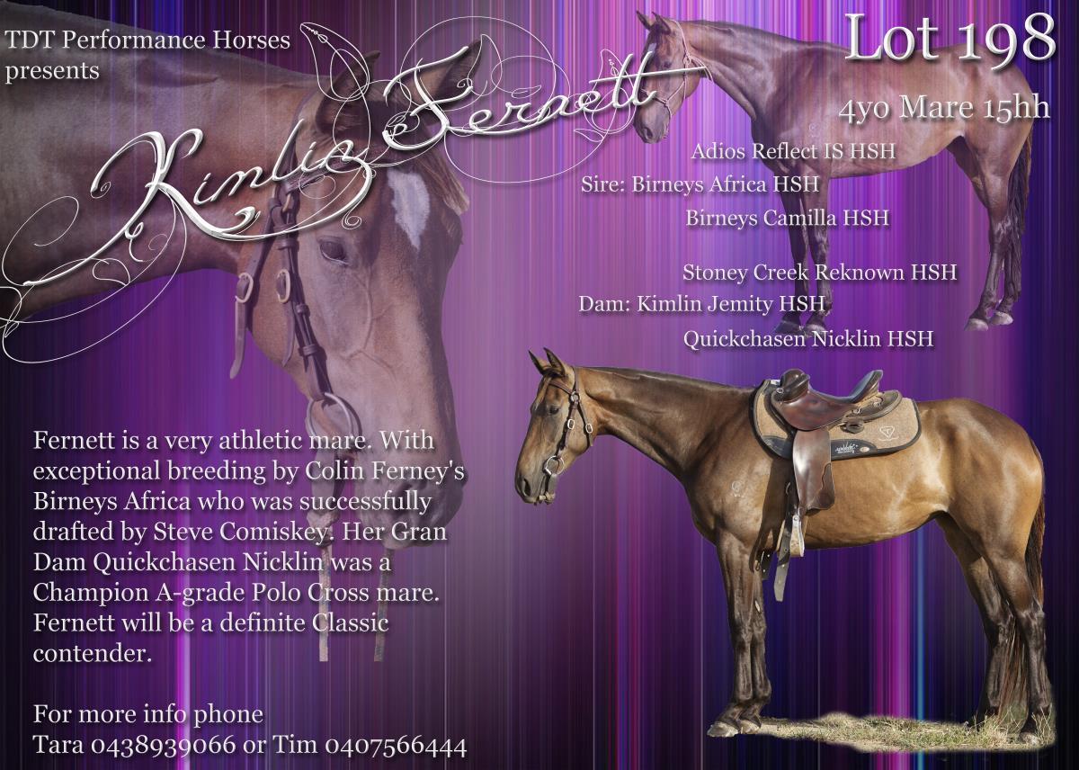 Fernett is a very athletic mare. With exceptional breeding by Colin Ferney's Birneys Africa who was successfully drafted by Steve Comiskey. Her Gran Dam Quickchasen Nicklin was a Champion A-grade Polo Cross mare. Fernett will be a definite Classic contender.