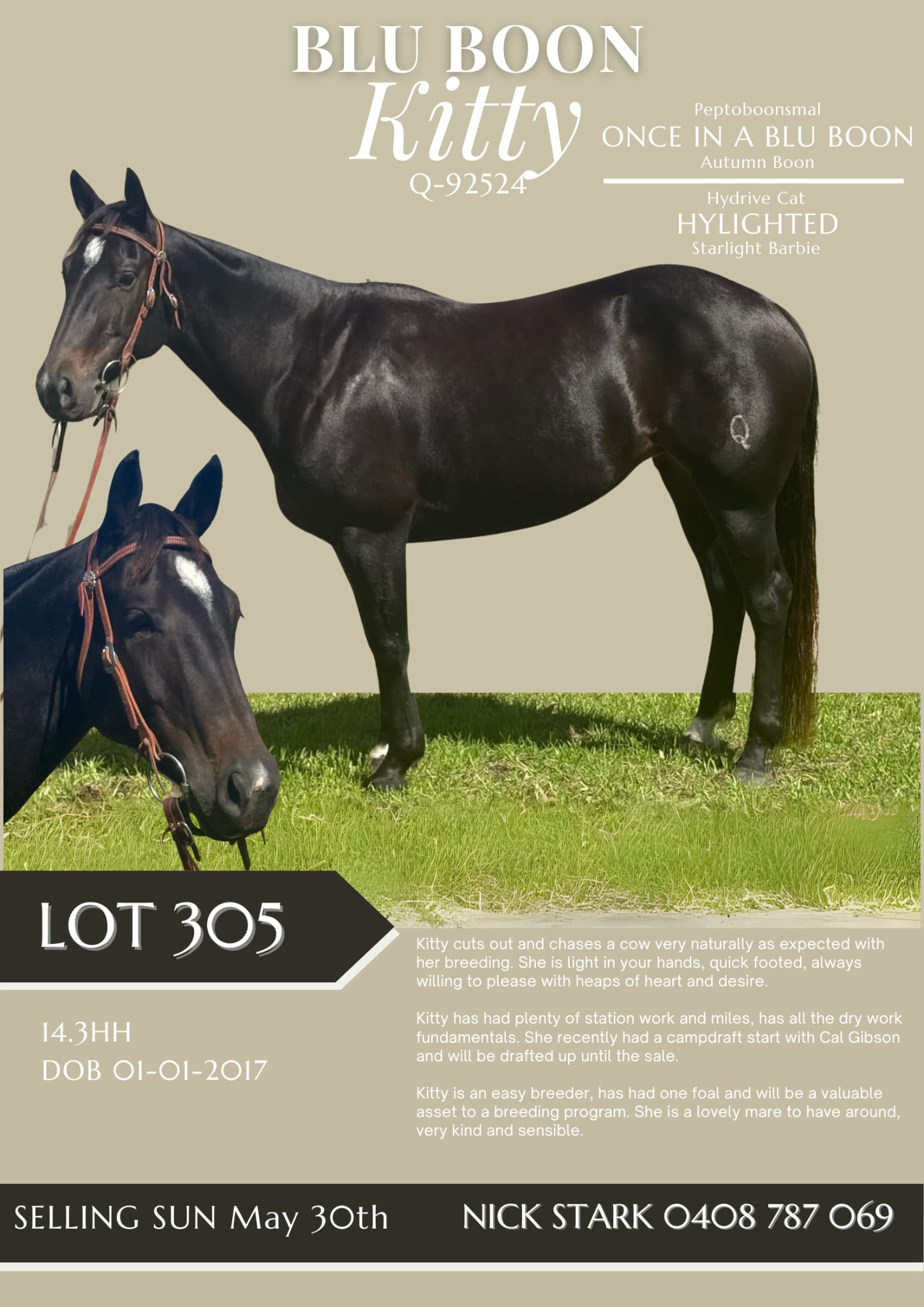 Blue Boon Kitty,, by ONE IN A BLU BOON, also the Sire of BADBOONARISING... BUT THAT NOT ALL....Kitty also has a strong mare line. Her grand dam STARLIGHT BARBIE is out of AQHA reverse World Champion, Barb OLena. An extremely well performed mare line all the way through. A mare with a wealth of breeding and talent, that ticks all the boxes. • Kitty is light in your hands and quick footed with a beautiful feel • She is very natural on a cow, always willing to please with heaps of heart and desire • She has had plenty of station work and miles • She has all the dry work fundamentals with a solid pattern on a cow • Has recently had a Campdraft start with Cal Gibson and will be drafted up until the sale • Kitty has had one foal. An easy breeder and a valuable asset to a breeding program down the track • Lovely to have around, kind and sensible