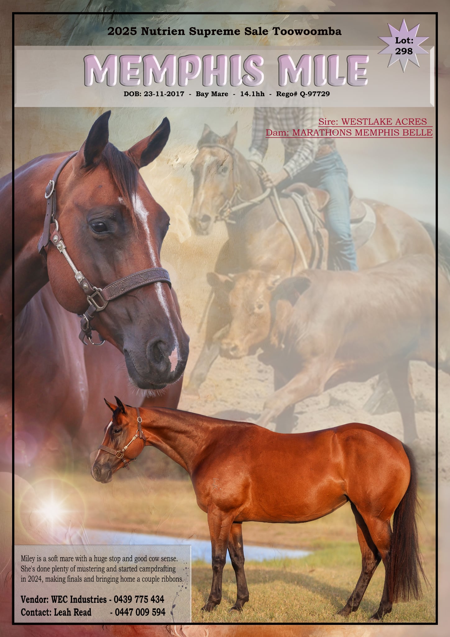 Miley is a soft mare with a huge stop and good cow sense. She's done plenty of mustering and started campdrafting in 2024, making finals and bringing home a couple ribbons.
