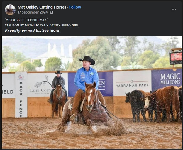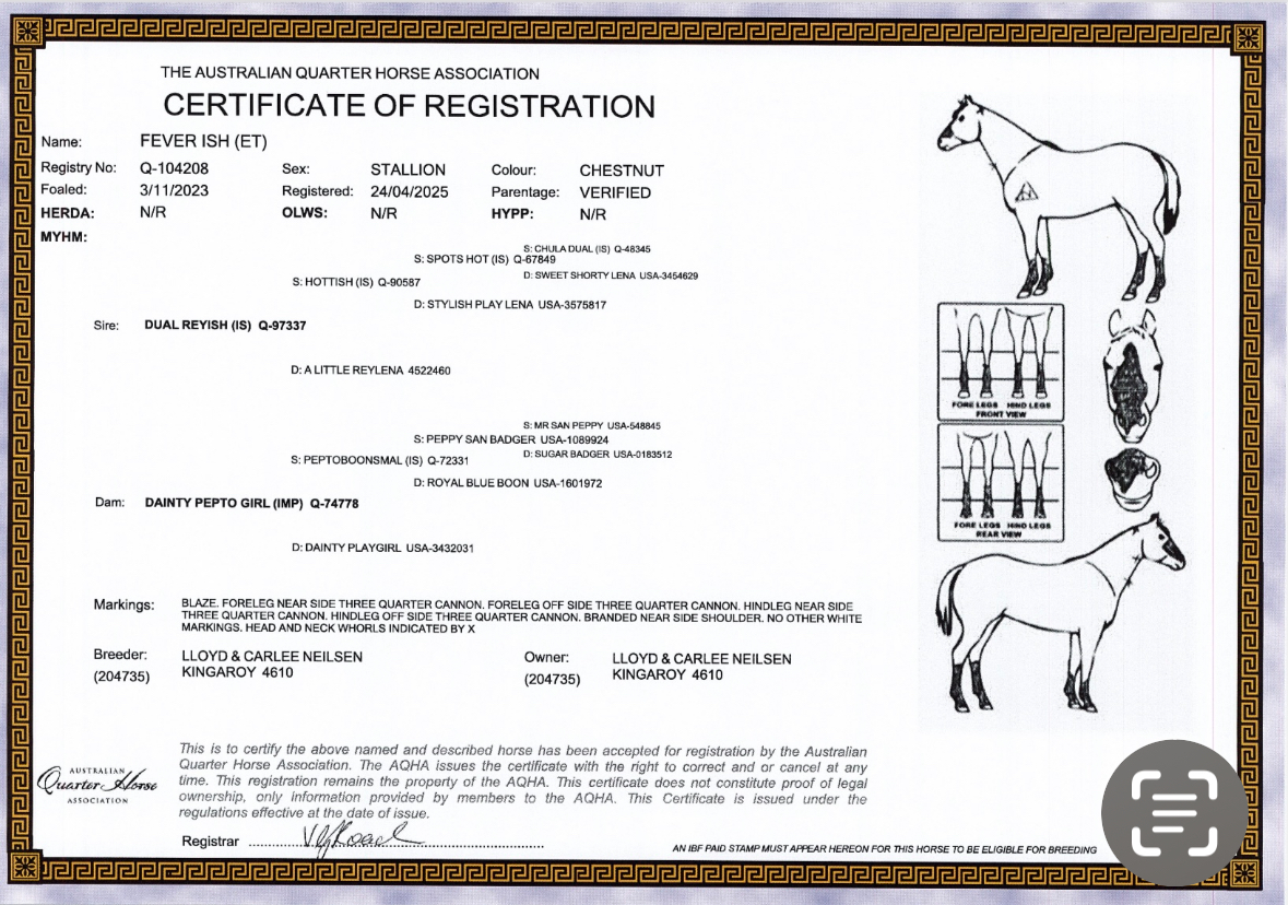 FEVER ISH Q-104208 Chestnut Stallion Vendor: LLOYD & CARLEE NEILSEN, GORDONBROOK, QLD. DUAL REYISH– LTE $456,016 USD. NCHA Hall of Fame, NCHA Open Futurity champion. Sire of 96 money earners with progeny LTE $1,296,171 USD, including Weezy F Baby $163,266 NCHA Non-Pro Futurity champion, LBR Hangem $145,998 PCCHA Open Derby champion and NCHA Super Stakes reserve champion, Ten In Texas $78,537, The Big Badd Wolf $73,143, Rey To The West $72,249. 1st Dam - Dainty Pepto Girl (Sire: Peptoboonsmal $25 million dollar sire, 1995 NCHA Open Futurity Champion LTE $165,304) Progeny LTE: $141,652. An exceptional broodmare. Her progeny includes Duplicity, (Sire: Dual Rey) 2018 NCHA Open Futurity Champion & NCHA Open Derby Reserve-Champion, LTE $102,248.45. Pimped Up Cat (Sire: Highbrow Cat) NCHA LTE: $30,091, 2016 NCHA Non-Pro Futurity Finalist, 2017 NCHA Open & Non- Pro Derby Finalist, 2018 NCHA Open Classic Finalist, 2019 NCHA Non-Pro Classic Champion. Pimped Up Cat - Camp Drafting: 2023 Finalist: Willinga Gold Buckle Open, Condamine Bell Open, Chinchilla Grandfather Clock Open, & Warwick Gold Cup Stallion Draft. 2024: 4th - ACA Novice horse of the Year. (From 1,096 competitors) Metallic to the Max (Sire: Metallic Cat) Co-Champion 2024 NCHA Champion of Champions Cutting, 2024 NCHA Open Classic Finalist. Platinum CD (Sire: Highbrow CD) 2024 NCHA Amateur Classic Finalist. The Girl in the Spiders Web (Sire: Stevie Rey Von) 2024 ARCHA Snaffle Bit Futurity Champion. 2nd Dam – Dainty Playgirl (by Freckles Playboy) LTE $271,821, 1998 NCHA Futurity Open Champion. Dam of 18 money earners with progeny LTE $741,377 including, Mandalay Rey $146,079, Metallic Knight $138,312, Dualin Lil Playgirl $95,516. Sire Freckles Playboy NCHA $59,975.59, Hall of Fame inductee 2013, ranked third all-time leading sire, by offspring earnings $24.5 million. 3rd Dam – Dainty Lena (by Smart Little Lena) Dam of 9 money earners with progeny LTE $306,749 including, Dainty Playgirl $271,821 and Lenas Little Hickory $18,632. Sire Smart Little Lena LTE $577,652, Triple Crown (Cutting) Winner Hall of Fame inductee, he has sired earners of over $41.2 million and is the number 2 all-time Leading Sire. Contact: 0427757906