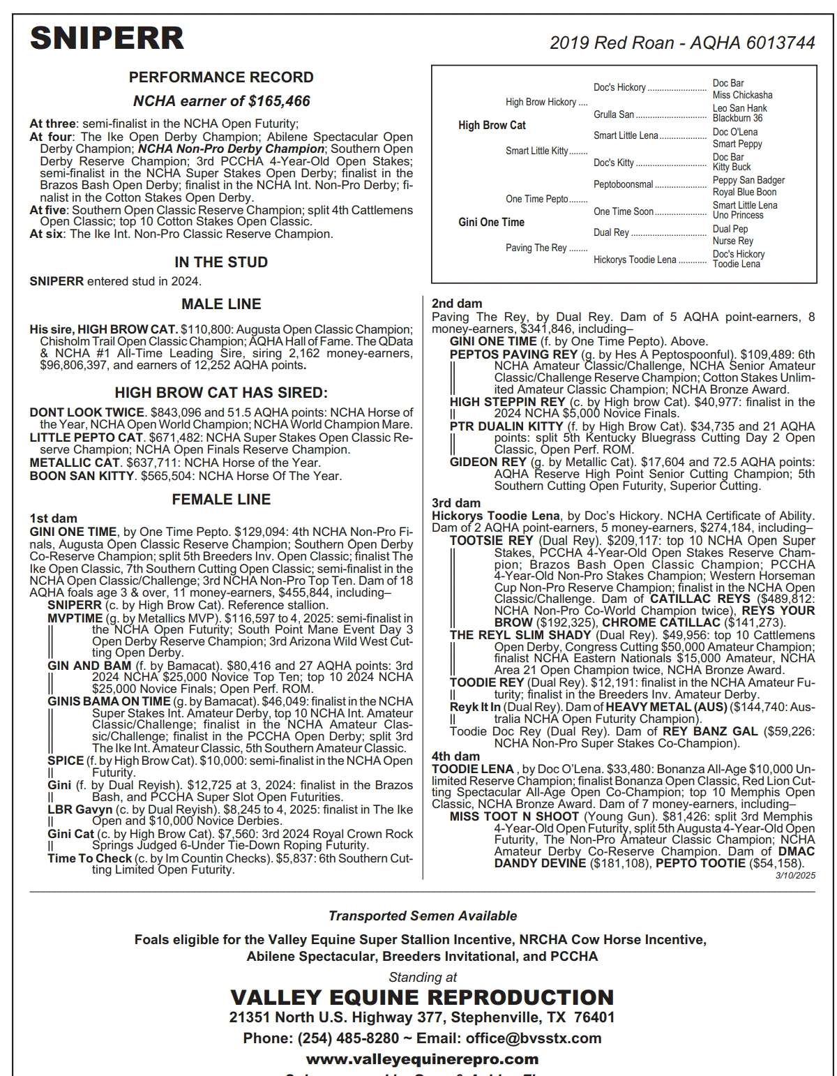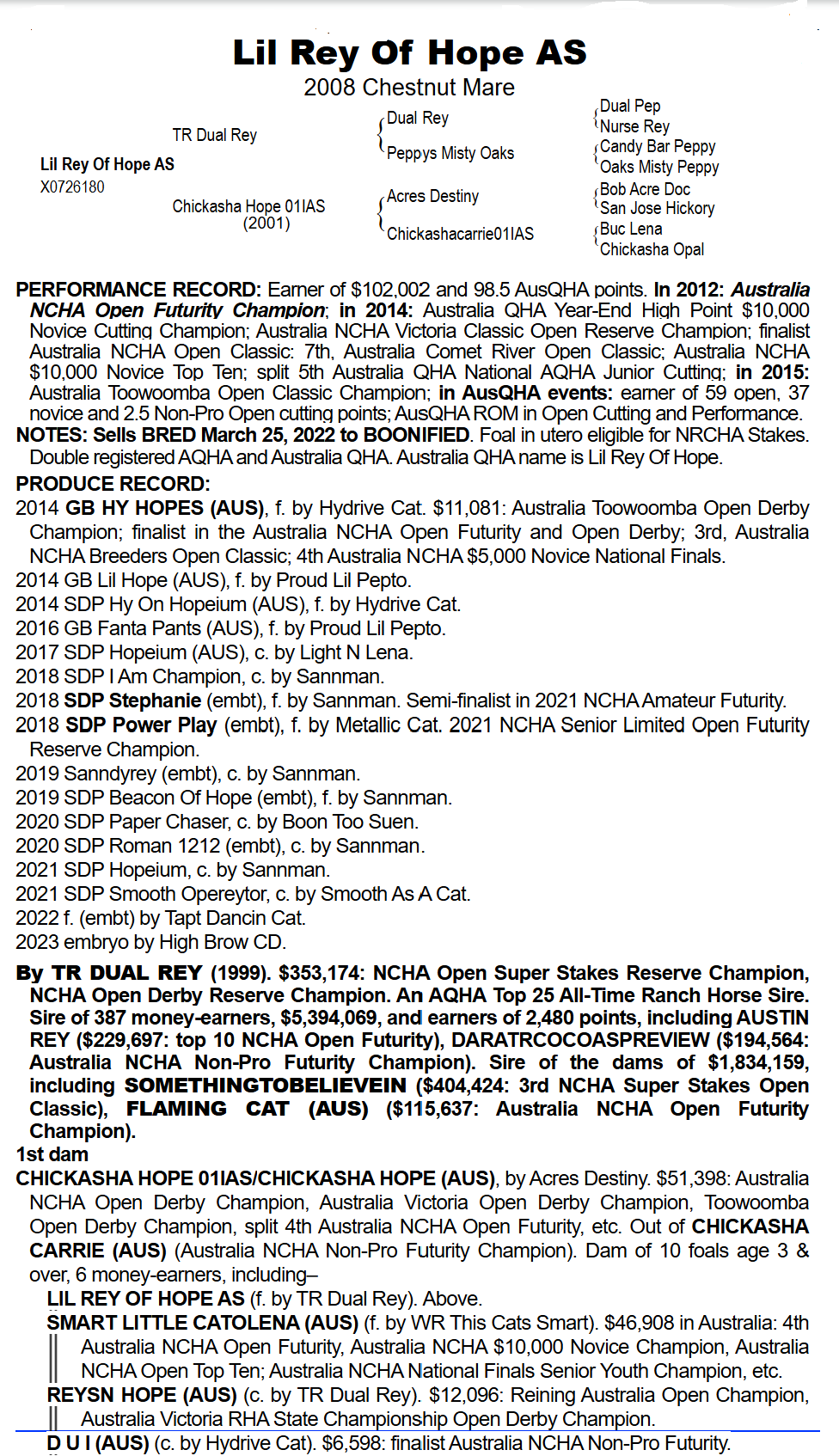 Lil Rey of Hope PERFORMANCE RECORD: Earner of $102,002 US and 98.5 AusQHA points. In 2012: Australia NCHA Open Futurity Champion; in 2014: Australia QHA Year-End High Point $10,000 Novice Cutting Champion; Australia NCHA Victoria Classic Open Reserve Champion; finalist Australia NCHA Open Classic: 7th, Australia Comet River Open Classic; Australia NCHA $10,000 Novice Top Ten; split 5th Australia QHA National AQHA Junior Cutting; in 2015: Australia Toowoomba Open Classic Champion; in AusQHA events: earner of 59 open, 37 novice and 2.5 Non-Pro Open cutting points; AusQHA ROM in Open Cutting and Performance. PRODUCE RECORD: 2014 GB HY HOPES (AUS), f. by Hydrive Cat. $11,081: Australia Toowoomba Open Derby Champion; finalist in the Australia NCHA Open Futurity and Open Derby; 3rd, Australia NCHA Breeders Open Classic; 4th Australia NCHA $5,000 Novice National Finals. 2014 GB Lil Hope (AUS), f. by Proud Lil Pepto. 2014 SDP Hy On Hopeium (AUS), f. by Hydrive Cat. 2016 GB Fanta Pants (AUS), f. by Proud Lil Pepto. 2017 SDP Hopeium (AUS), c. by Light N Lena. 2018 SDP I Am Champion, c. by Sannman. 2018 SDP Stephanie (embt), f. by Sannman. Semi-finalist in 2021 NCHA Amateur Futurity. 2018 SDP Power Play (embt), f. by Metallic Cat. 2021 NCHA Senior Limited Open Futurity Reserve Champion. Many other offspring in training in the US, 3 fillies and 1 colt retained By TR DUAL REY (1999). $353,174: NCHA Open Super Stakes Reserve Champion, NCHA Open Derby Reserve Champion. An AQHA Top 25 All-Time Ranch Horse Sire. Sire of 387 money-earners, $5,394,069, and earners of 2,480 points, including AUSTIN REY ($229,697: top 10 NCHA Open Futurity), DARATRCOCOASPREVIEW ($194,564: Australia NCHA Non-Pro Futurity Champion). Sire of the dams of $1,834,159, including SOMETHINGTOBELIEVEIN ($404,424: 3rd NCHA Super Stakes Open Classic), FLAMING CAT (AUS) ($115,637: Australia NCHA Open Futurity Champion). 1st dam CHICKASHA HOPE 01IAS/CHICKASHA HOPE (AUS), by Acres Destiny. $51,398: Australia NCHA Open Derby Champion, Australia Victoria Open Derby Champion, Toowoomba Open Derby Champion, split 4th Australia NCHA Open Futurity, etc. Out of CHICKASHA CARRIE (AUS) (Australia NCHA Non-Pro Futurity Champion). Dam of 10 foals age 3 & over, 6 money-earners, including– LIL REY OF HOPE AS (f. by TR Dual Rey). Above. SMART LITTLE CATOLENA (AUS) (f. by WR This Cats Smart). $46,908 in Australia: 4th Australia NCHA Open Futurity, Australia NCHA $10,000 Novice Champion, Australia NCHA Open Top Ten; Australia NCHA National Finals Senior Youth Champion, etc. REYSN HOPE (AUS) (c. by TR Dual Rey). $12,096: Reining Australia Open Champion, Australia Victoria RHA State Championship Open Derby Champion. D U I (AUS) (c. by Hydrive Cat). $6,598: finalist Australia NCHA Non-Pro Futurity. QD Sniperr (https://www.valleyequinerepro.com/stallions/sniperr/) - By High Brow Cat, out of One Time Pepto mare with $129,000 LTE; 14.2hh, 7 panel negative, winner of $165,000 US and still competing; first foals coming in 2025 NOTES: AI at Central West Equine 22.10.24, embryo flush and implant 30.10.24, positive 45 day scan 5.12.24, positive follow up scan 25.2.2025. Recip subject to return contract to CWE. Please note, our recip will be at Waverton in Cargo (not central west equine as stated in catalogue) and available for pick up or consignment to transport for successful bidder.