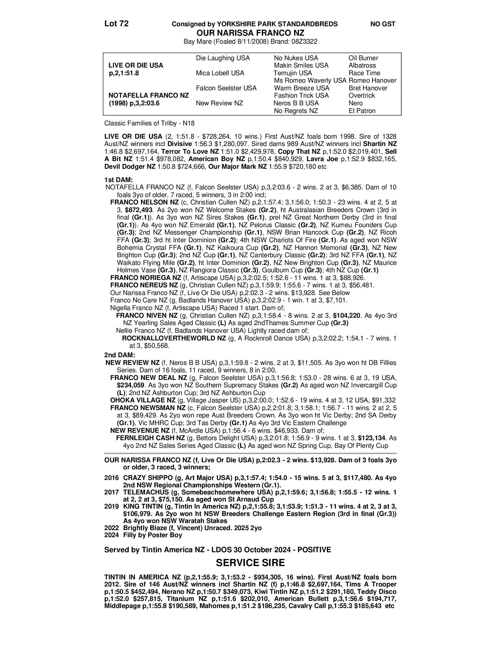 2-time winning broodmare who has had four foals to date, Crazy Shippo, 15 wins $117K, Telemachas 12 wins $75K, King Tintin 11 wins $109K plus two-year-old who has just qualified. Positive Test in foal to Tintin in America which would make the resultant foal a full to King Tintin. Call for any further information 0417541386