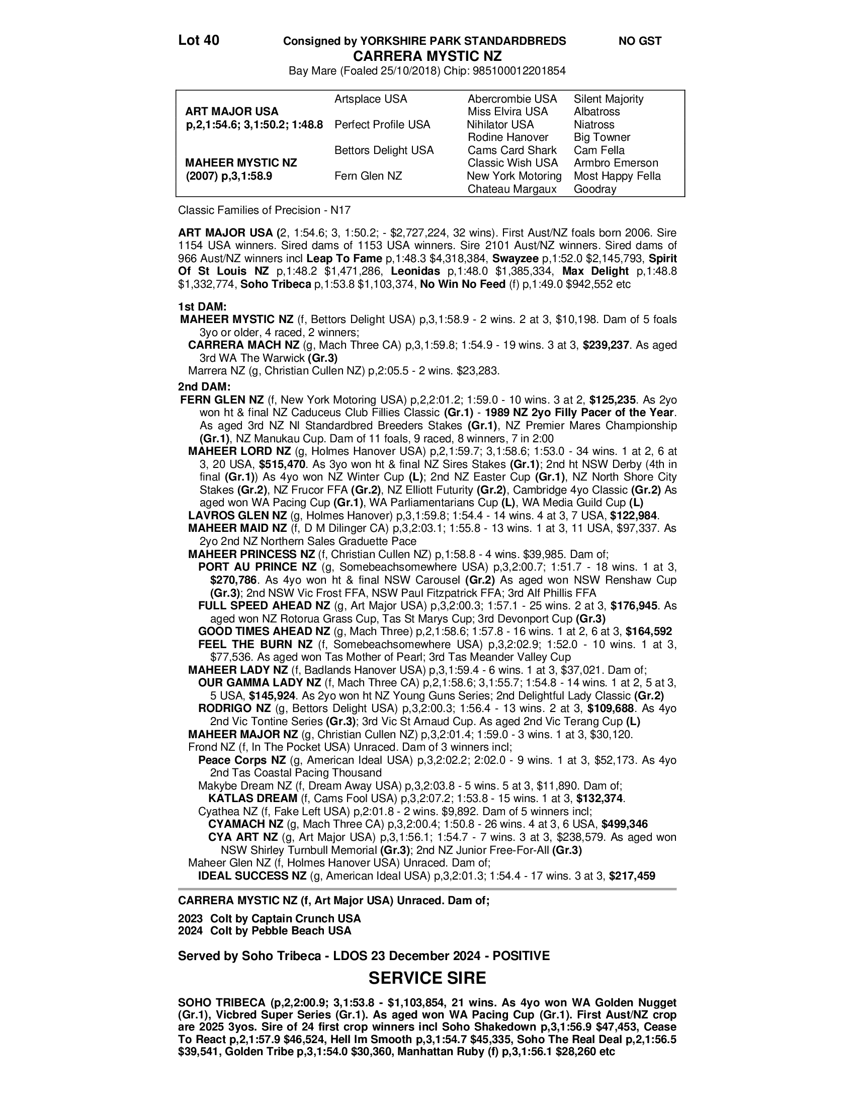 Carrera Mystic qualified but unraced due to injury is a half-sister to the very good Carrera Mach 19 wins $239K. She has had two foals to date - first foal a Captain Crunch colt sold at 2025 Nutrien yearling sale Lot 359. Carrera Mystic is a daughter of Maheer Mystic who is out of the very good NZ mare in Fern Glen NZ 2YO of the Year and dam of Maheer Lord & Lavros Glen. Mare is in foal to Soho Tribecca.