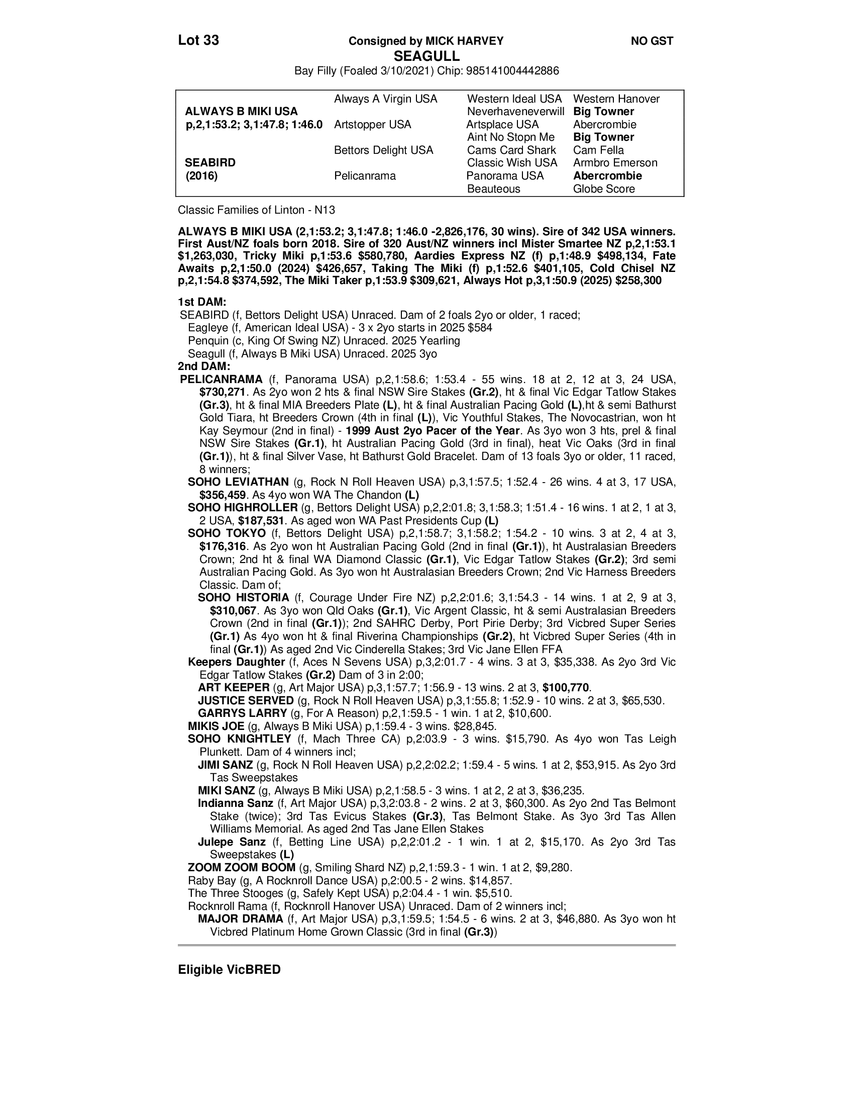 SEAGULL. Always B Miki 3yr old filly out of Bettors Delight mare SEABIRD out of Champion Pelicanrama; a Full sister to GR1 performer Soho Tokyo the dam of Group1 winner Soho Historia.