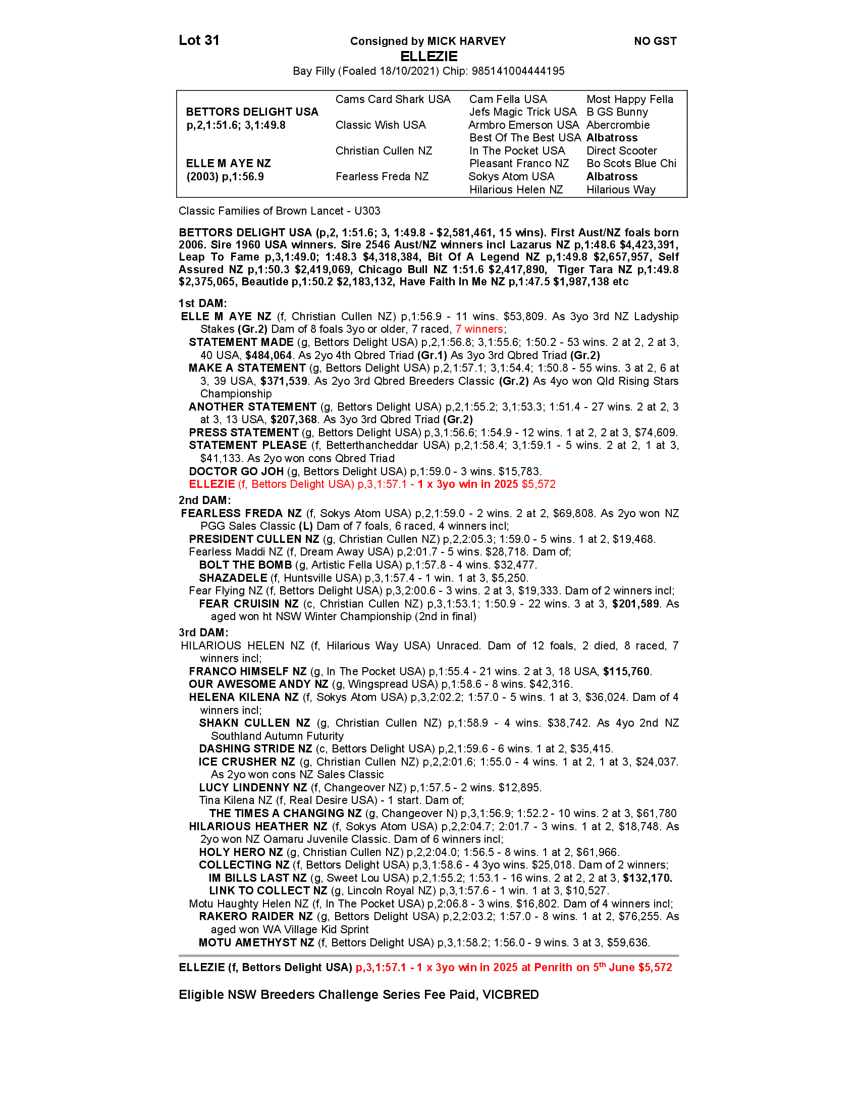 Beautiful 3yr old Bettors Delight Filly from a good winning family. Sister to 5 winners; Sound and in work; recent trial. Futurities VICBRED