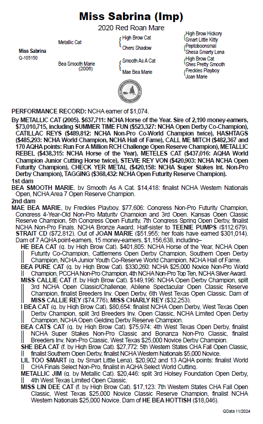 An NCHA money earner sired by Metallic Cat out of a daughter of Smooth As A Cat from a Freckles Playboy, this mare is a fully trained cutting horse with earnings in the USA and trained by Kenny Platt who won the 2024 NCHA Futurity. She is an outstanding type of mare with a lovely rein and strong back end so take her back to the cutting pen or draft her, the hard work has been done here and with the import costs being over 50k, she is a one off mare offered for your consideration. Her dam has NCHA earnings of $14,000 and her dam has $77,000. 00 and she is out of an NCHA Producer of $1,156,638.00 including He Bea Cat, NCHA Horse of the Year and NCHA Open Futurity Co-Champion. Miss Sabrina is your chance to play big in the winners circle and she will quickly pay for herself with Embryo Transfers to guarantee your investment is well and truly paid for.