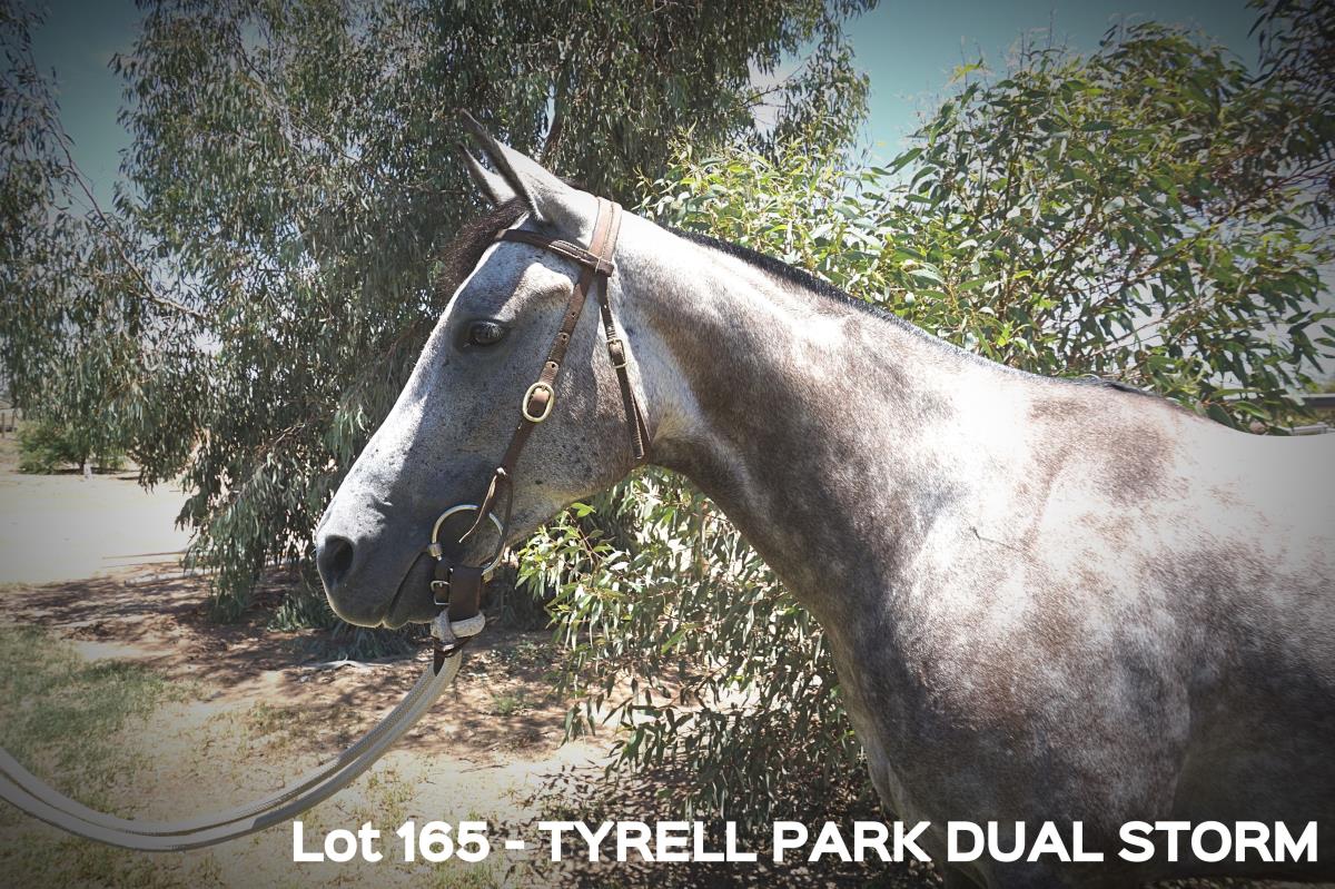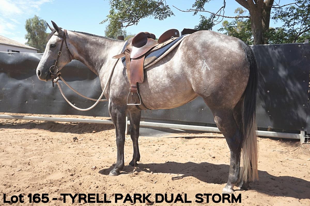 Tyrell Park Dual Storm, a beautiful, athletic grey filly who has had a full cutting training program. She has a good length of rein and is a very soft mare. Has had plenty of mustering and feedlot work.