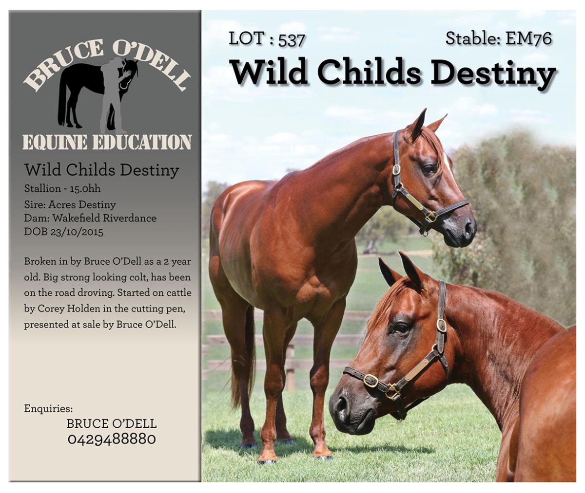 Wild Childs Destiny broken in by Bruce O'Dell as a 2yo. Big strong looking colt, has been on the road droving and started on cattle by Cory Holden in the cutting pen, presented at sale by Bruce -0429 488 880.