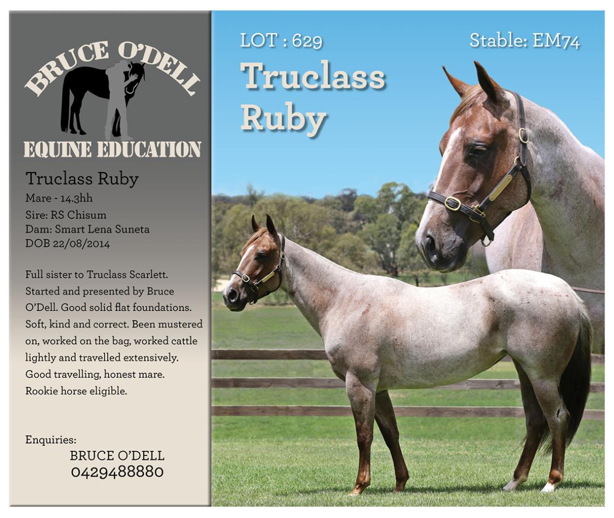 Full sister to Truclass Scarlett. Started and presented by Bruce O'Dell. Good solid flat foundations. Soft, kind and correct. Been mustered on, worked on the bag, worked cattle lightly and travelled extensively. Good travelling, honest mare. Rookie horse eligible.