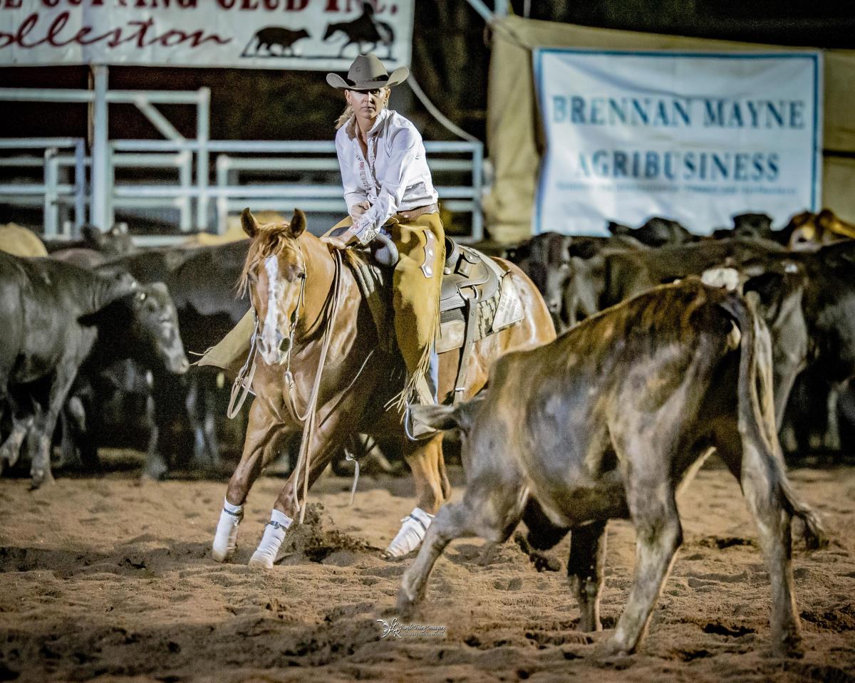 Big, pretty, strong mare. Fully trained cutting horse. Winner of the Injune NP Futurity. Very easy mare to have about, quiet, good minded and completely sound. Soft mare in a snaffle, quick and sharp footed. Outstanding prospect for cutting or drafting