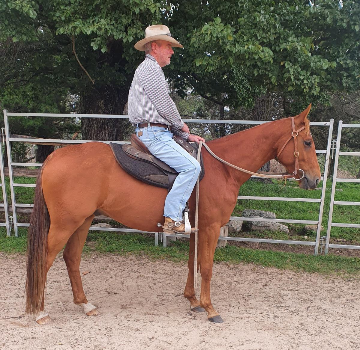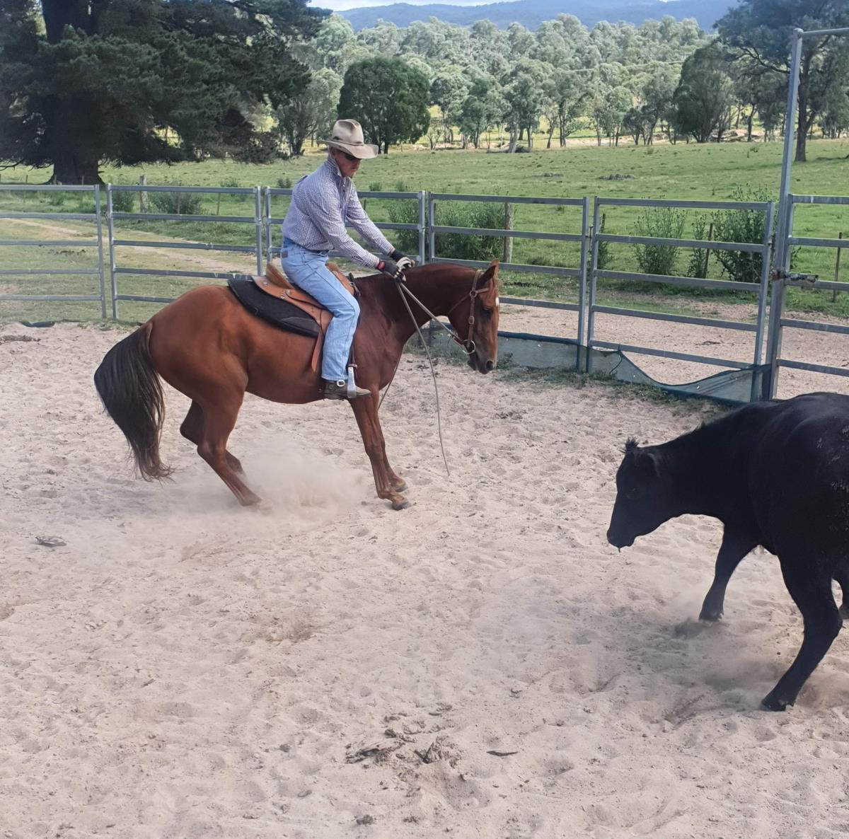 Creedmoore is a soft, kind, athletic One Moore Playboy gelding. He is smooth travelling, cowy, with a solid foundation. He is well started on cattle and the mechanical cow and has done plenty of mustering.