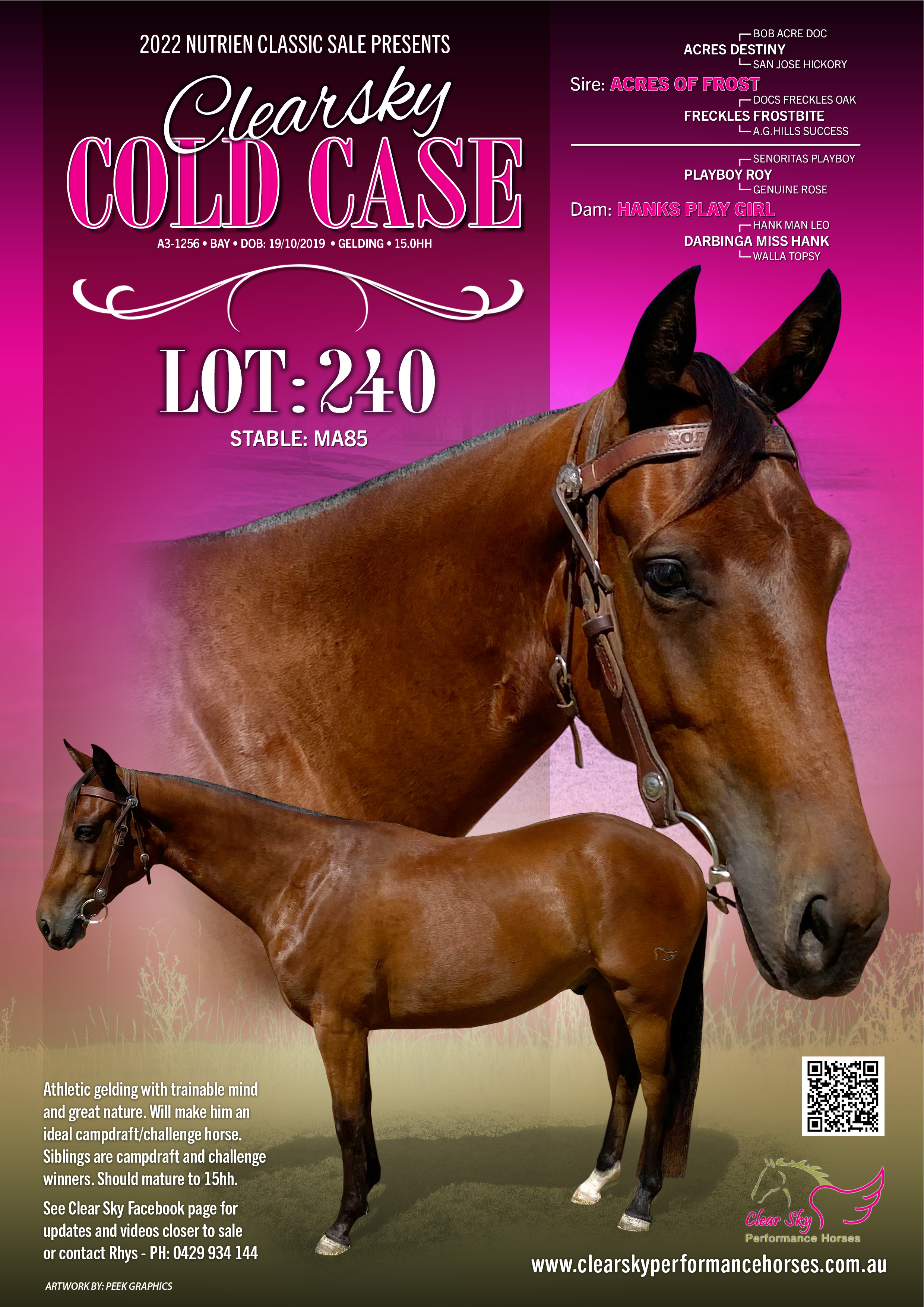 Athletic gelding with trainable mind and great nature. Will make him an ideal campdraft/challenge horse.Siblings are campdraft and challenge winners. Should mature to 15hh. See Clear Sky Facebook page for updates and videos closer to sale or contact Rhys 0429934144.
