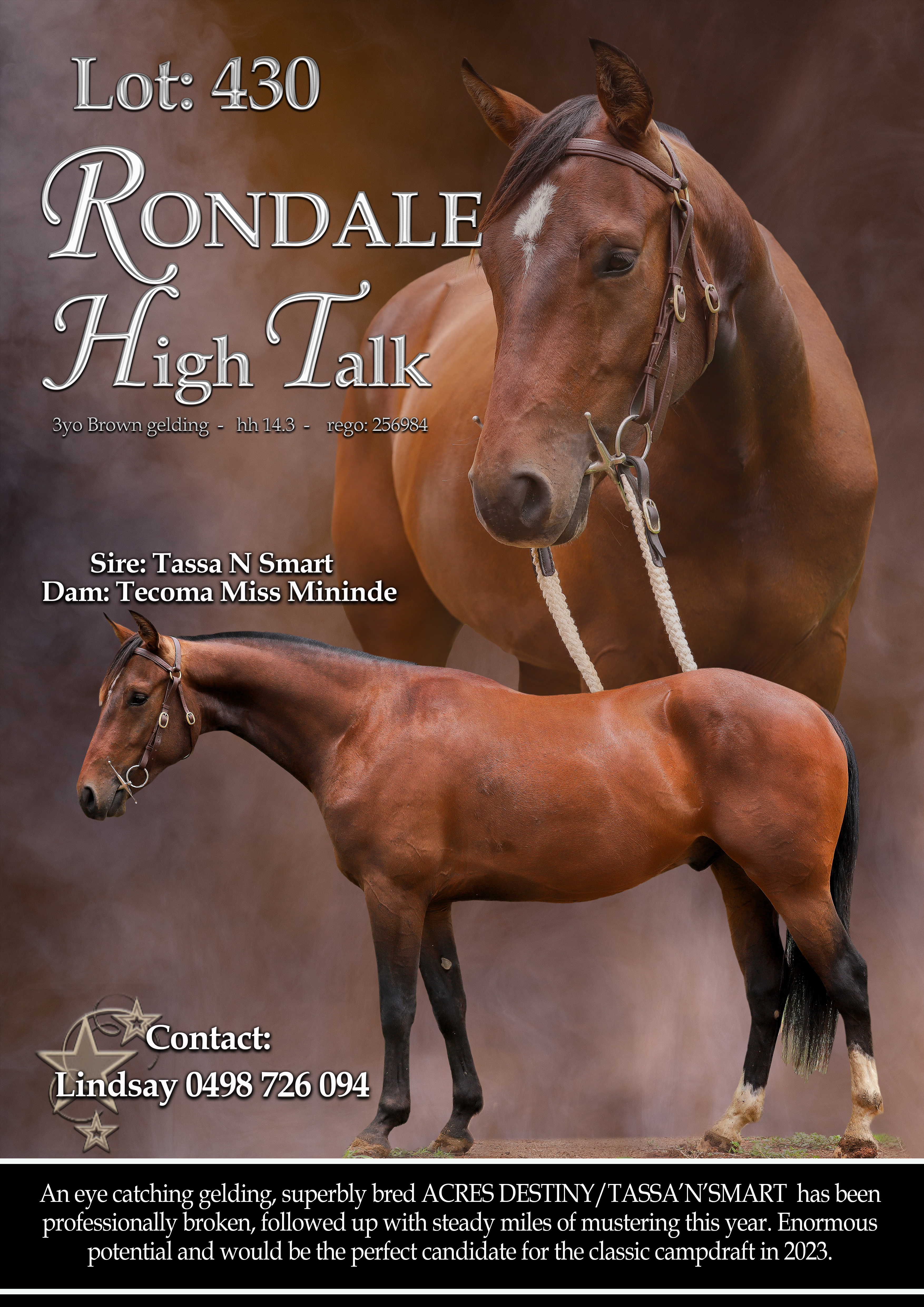 An eye catching, superbly bred ACRES DESTINY / TASSA'N'SMART gelding that has been professionally broken, followed up with steady miles of mustering this year. Enormous potential and would be the perfect candidate for the Classic Campdraft in 2023. Can AQHA-register.