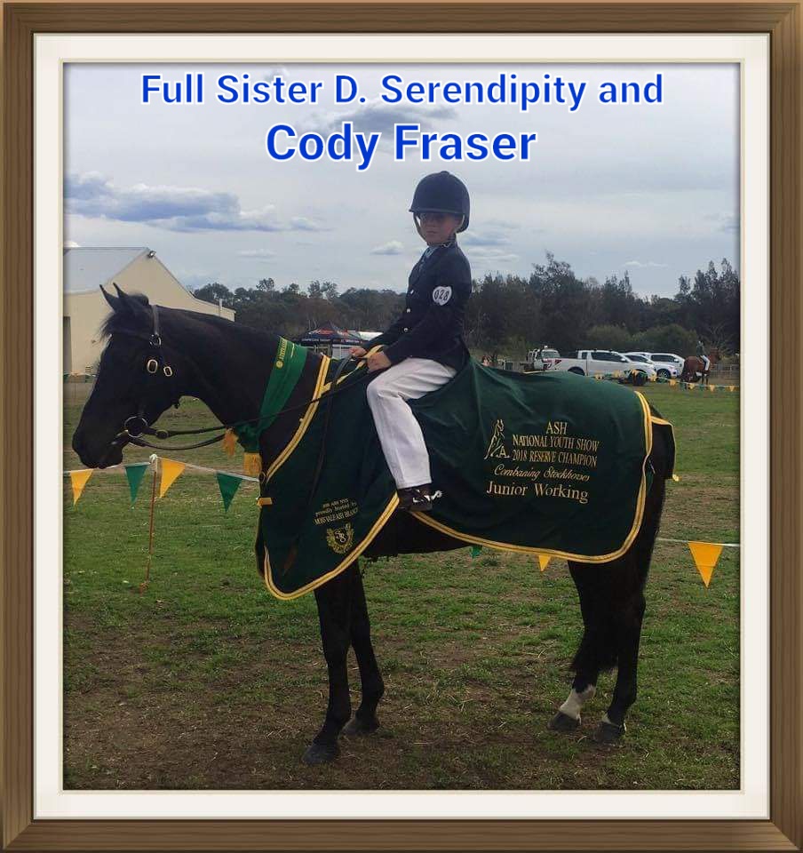 This year we are offering 2 very special horses, they are actually the last of a line. They are both full siblings and the last 2 out of Hazelwood Comma (Dogwood Commet x Seventy Seven Revenge mare) and by Serenity. Full siblings to Derowie Serendipity (Glen Fraser's Katie) who has won the ASH National 3yo Futurity, Champion Working ASH Sydney Royal plus a State and National Champion.