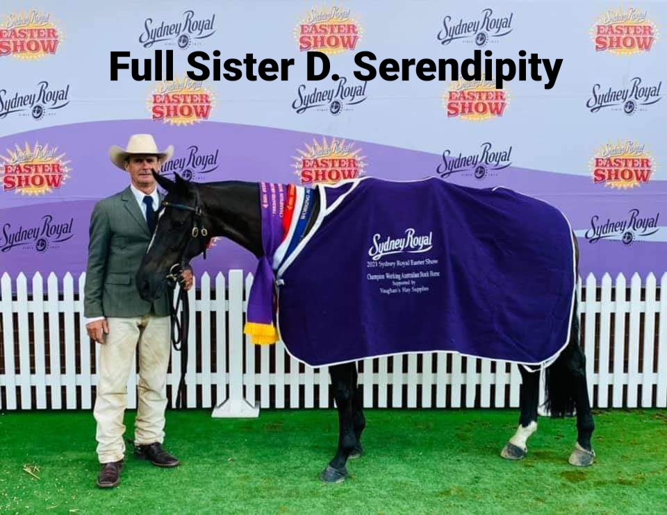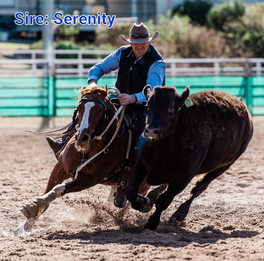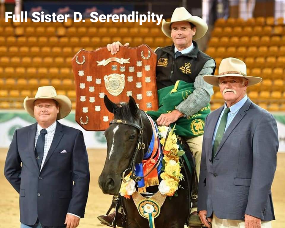 Full sister to D. Serendipity winner of ASH National 3yr old Futurity and Champ Working ASH Sydney Royal. This mare is an extreme athlete who is very natural on her feet and cow with a big heart. Very competitive mare.
