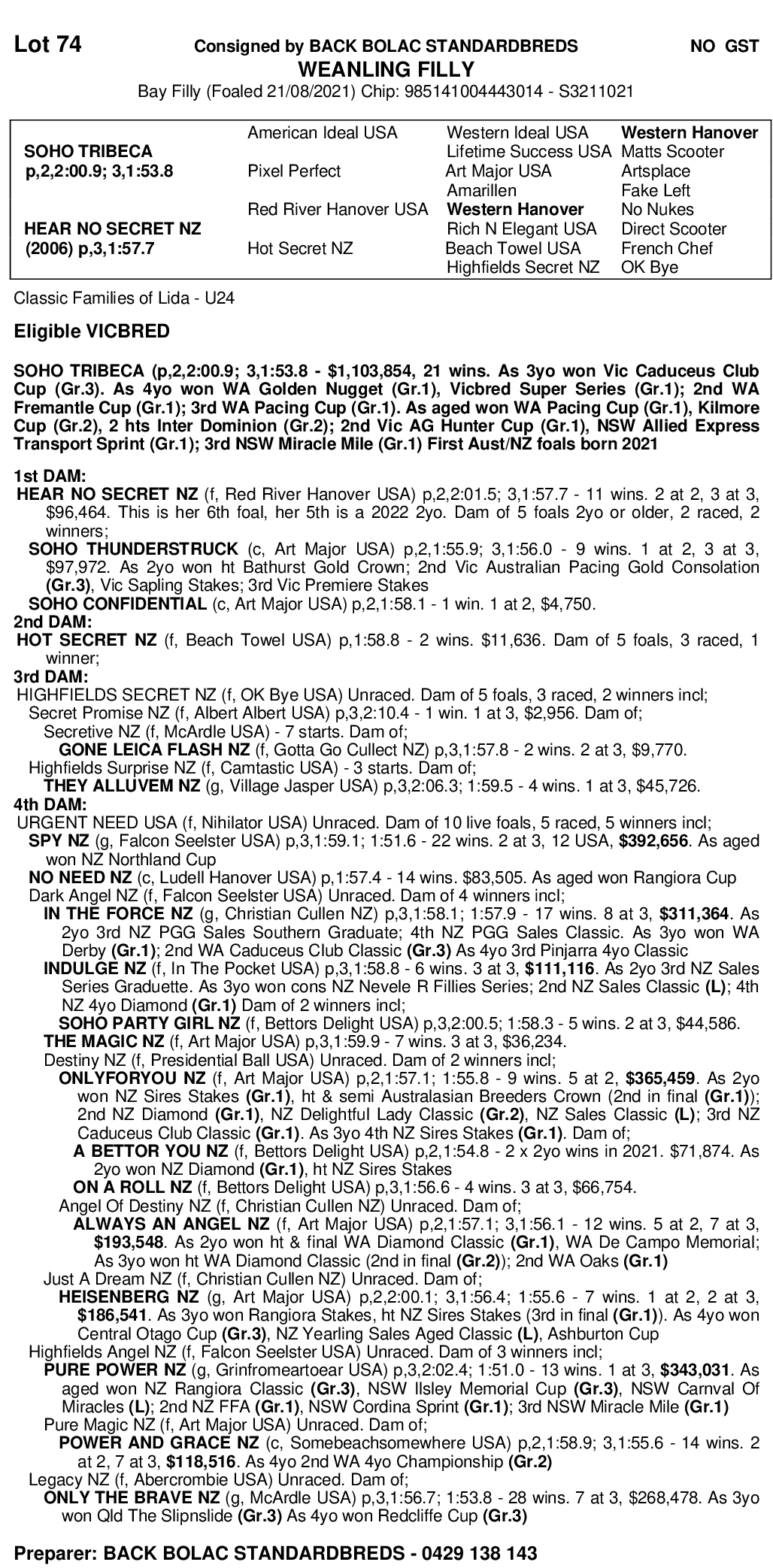 August filly out of Hear No Secret (Red River Hanover). Hear No Secret is a multiple time race winning mare ($96,464). Filly is a half to Soho Thunderstuck ($97,972) and Soho Confidential (1 race, 1 win).