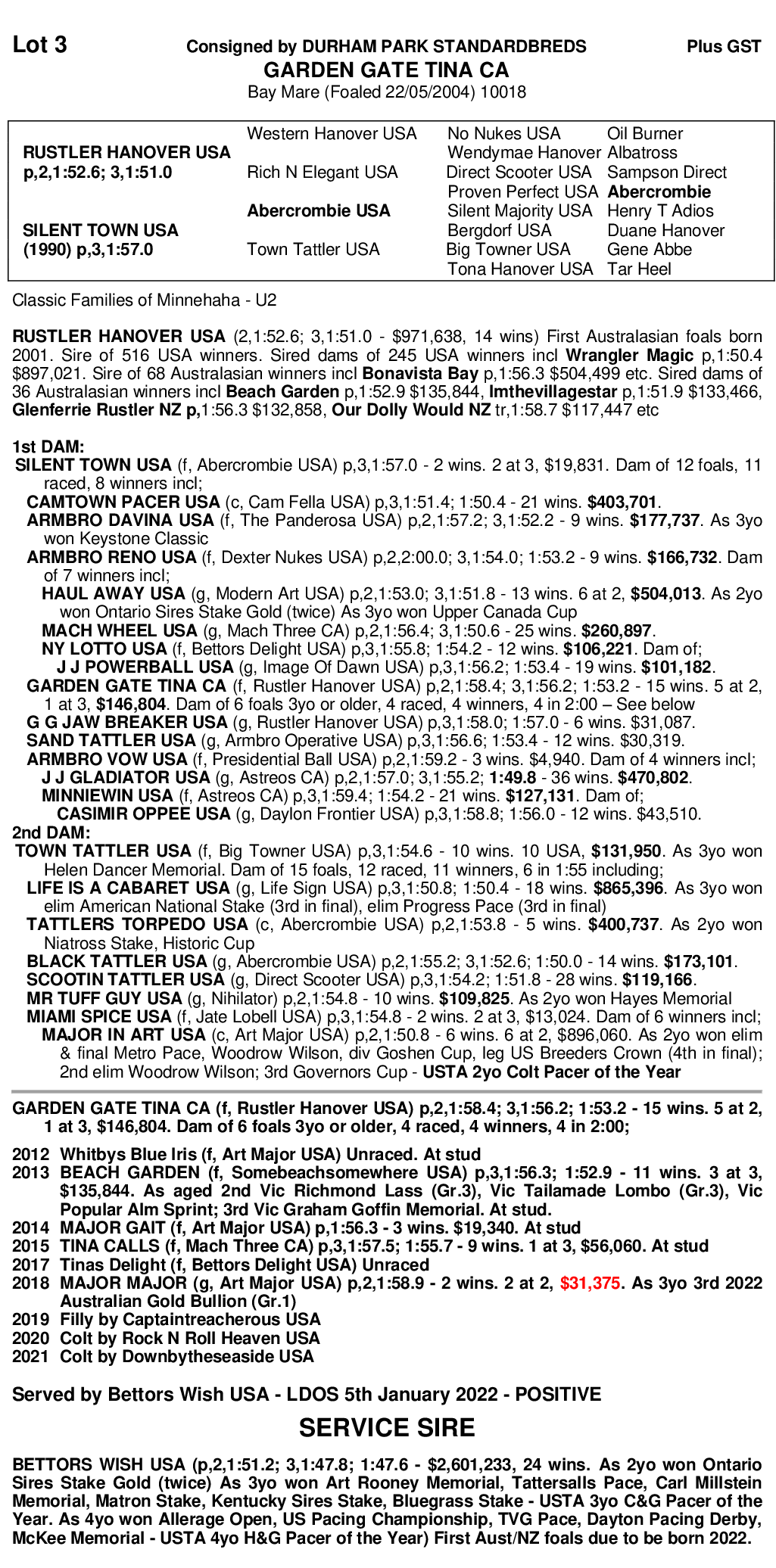 An imported mare with 15 wins and $146,804 in the US, and a mark of 1:53.2. A half sister to 7 winners including CAMTOWN PACER, $403, 000, 1:50.2, ARMBRO DAVINA, $177,000, 1:52.1, and ARMBRO RENA, $166,000, 1:53.1. Her 2nd dam is the awesome TOWN TATTLER, the dam of LIFE IS A CABERET, $865,000, TATTLERS TORPEDO, $400,000 and the grand dam of US 2YO of the year, MAJOR IN ART. She is the dam of BEACH GARDEN 1:52.9, $135,844, TINA CALLS, 1:55.7, $56,060, both retained by DURHAM PARK as broodmares. Her last three yearlings averaged $37,000.