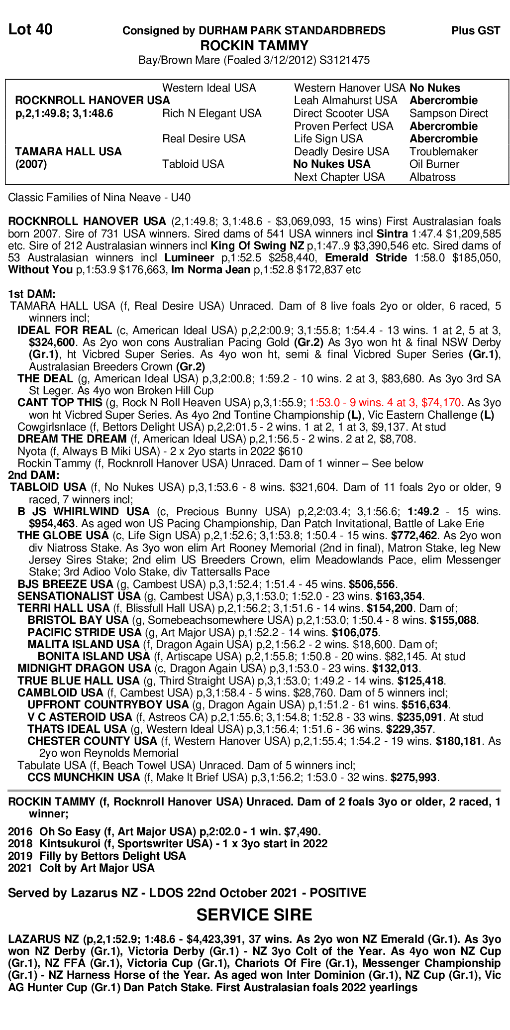 A ROCK N ROLL HANOVER half sister to NSW Derby winner IDEAL FOR REAL and CANT TOP THIS. She was injured as a weanling, never to race. She has an incredible pedigree and looks to match. Out of imported TAMARA HALL USA, a half sister to stakes winners BJ’S WHIRLWIND, 1:49.1, $954,000, THE GLOBE, 1:50.3, $767,000, BJ’S BREEZE, 1:51.2, $506,000 and TERRI HALL, 1:51.3, $154,000. Her yearlings have averaged $32,000.