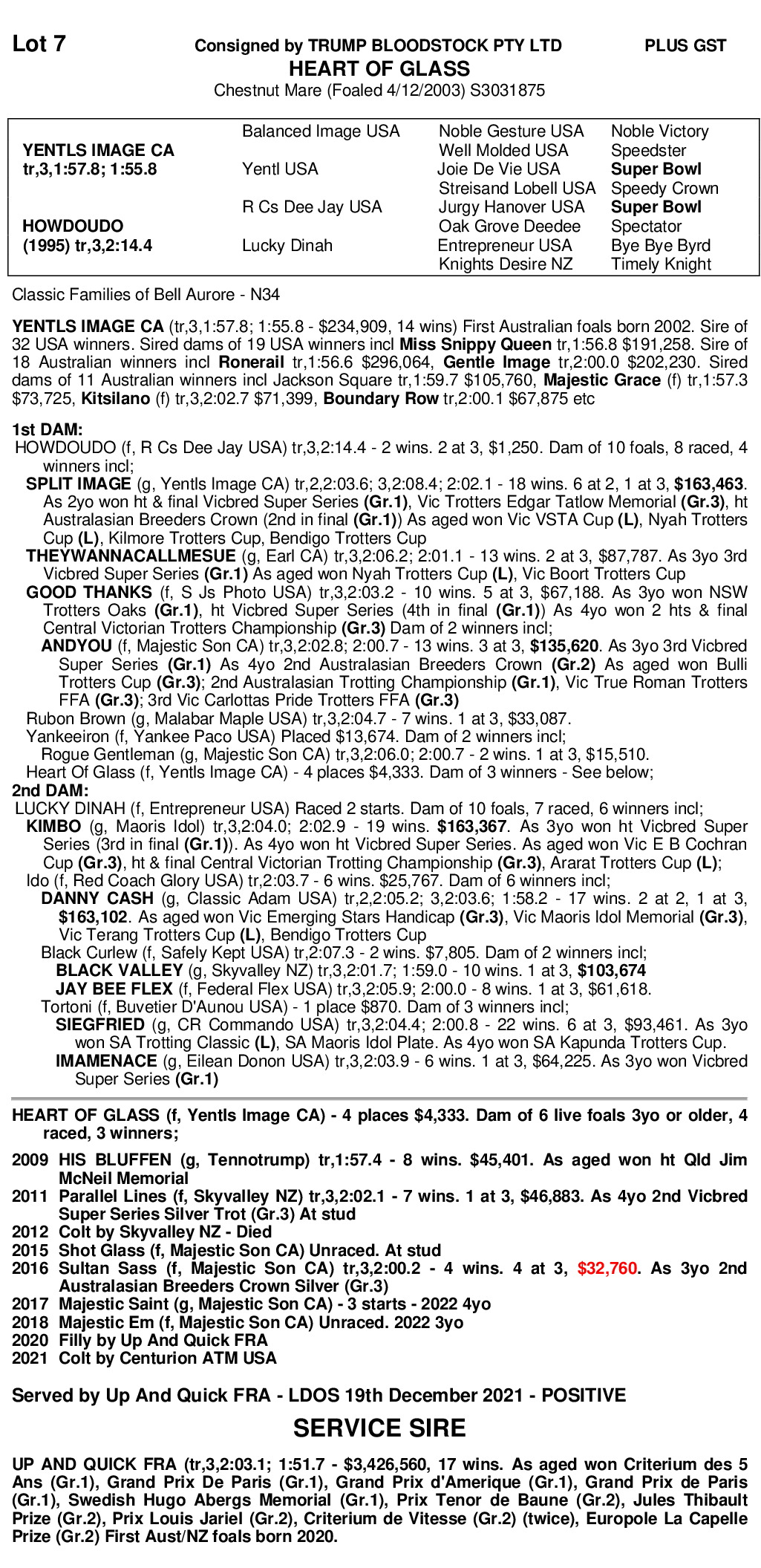 Heart Of Glass sells in foal to champion French Trotter Up And Quick - service fee has been paid