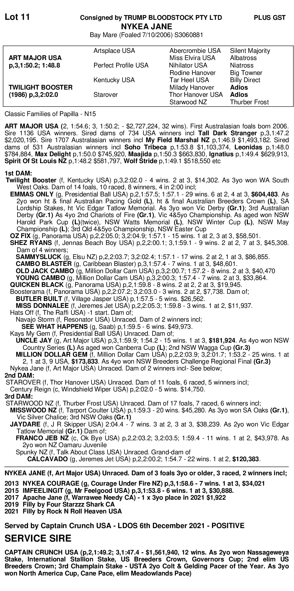 Nykea Jane is by champion stallion Art Major and is a half sister champion pacer Emmas Only $604.000