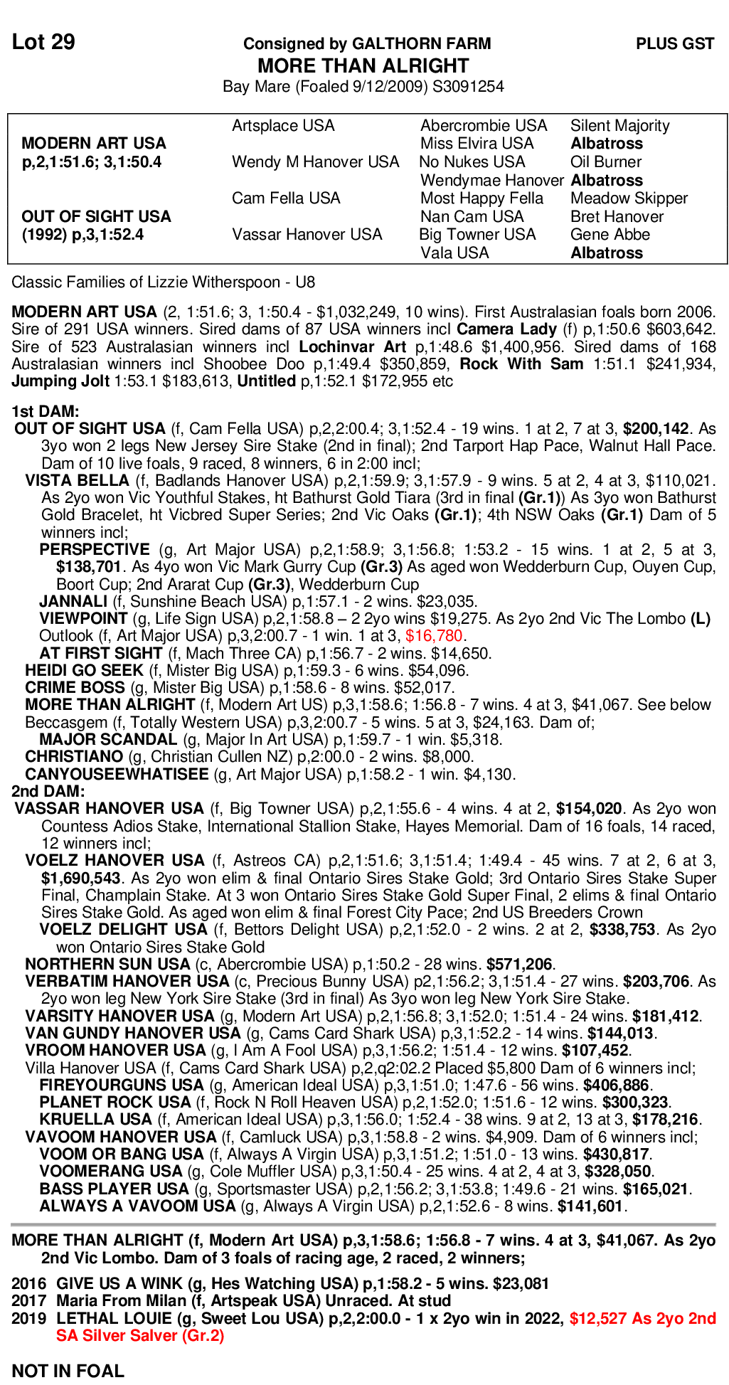 More Than Alright hasn't been bred the last two seasons as we simply have too many mares thus she is part of our reduction.