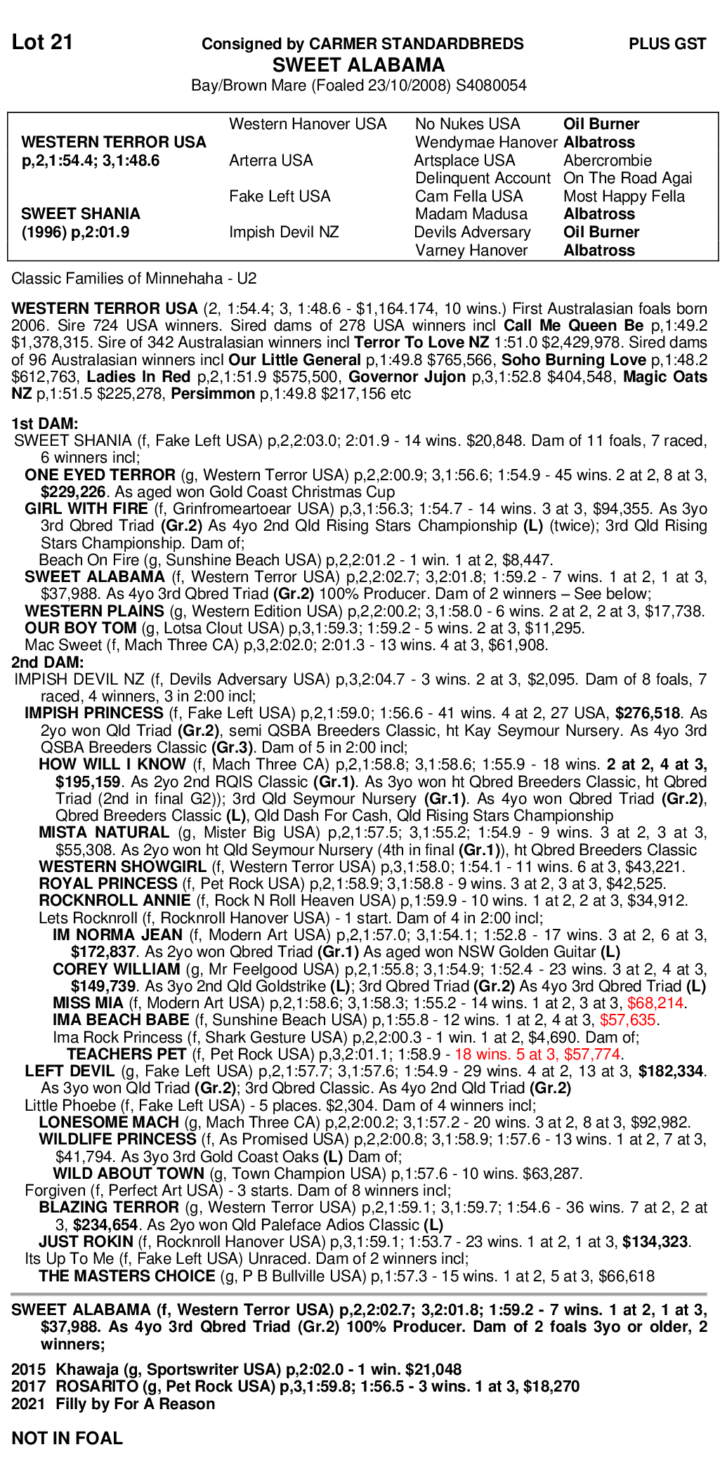 Dam: Sweet Shania produced: One Eyed Terror, 1.54.9, $229,226 and Girl With Fire 1.53.7, $94,355