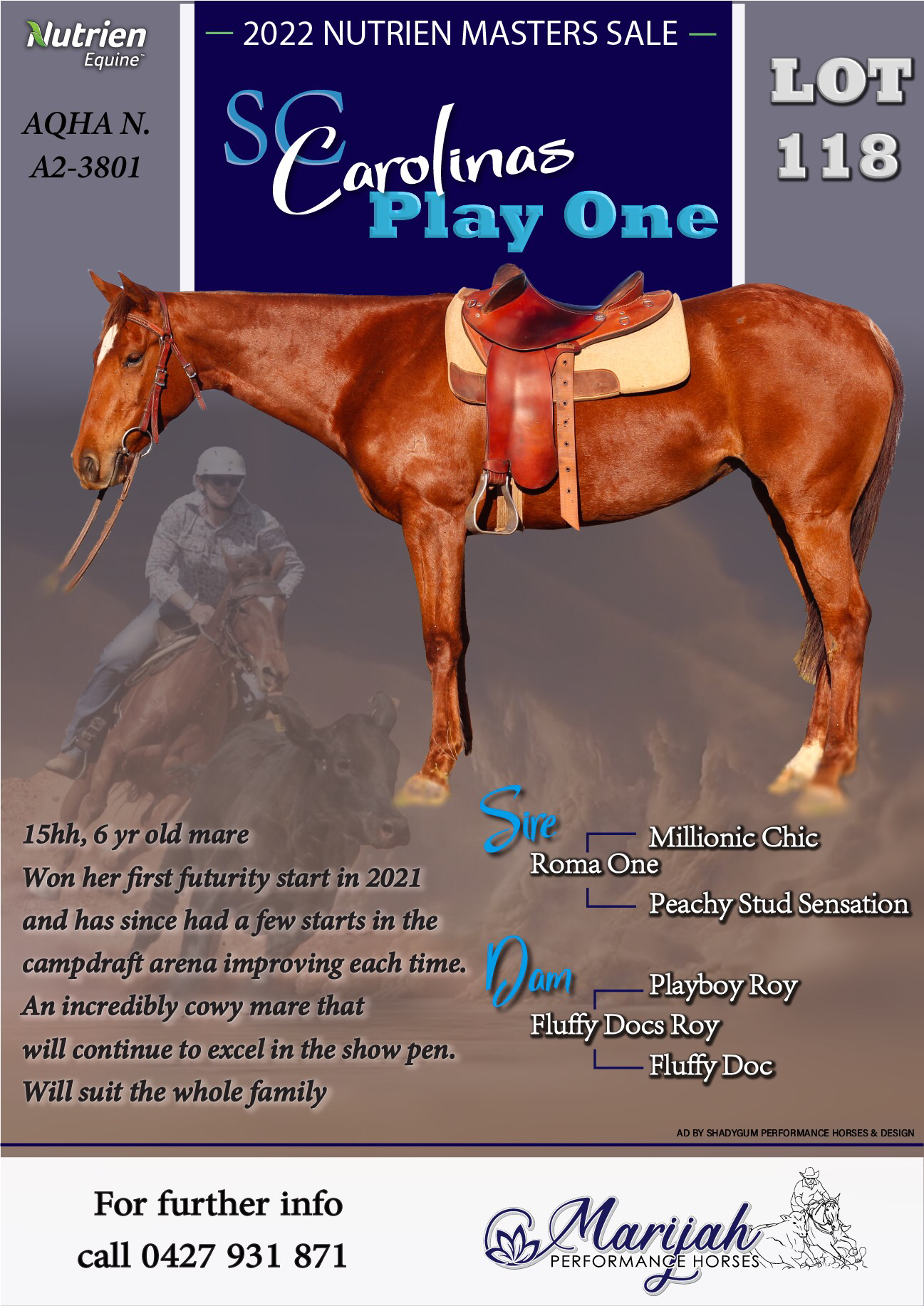 Won her first futurity start in 2021 and has since had a few starts in the campdraft arena improving each time. An incredibly cowy mare that will continue to excel in the show pen. Will suit the whole family. 0427931871