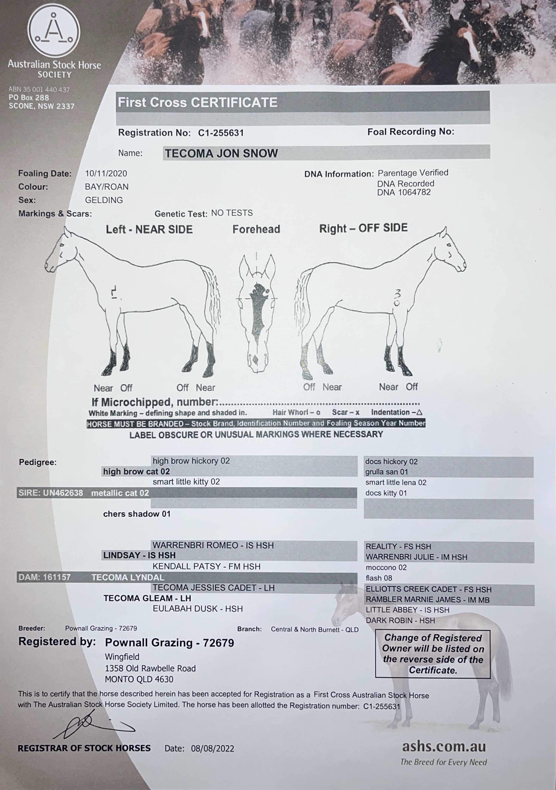 Stylish, Quiet, good confirmation. Broken in by Paul, had general work, another 3 months cutting program with Hugh Miles. Jon Snow has good stop, trainable mind. Cutting, campdraft, challenge prospect. Dam is Open Campdrafter.