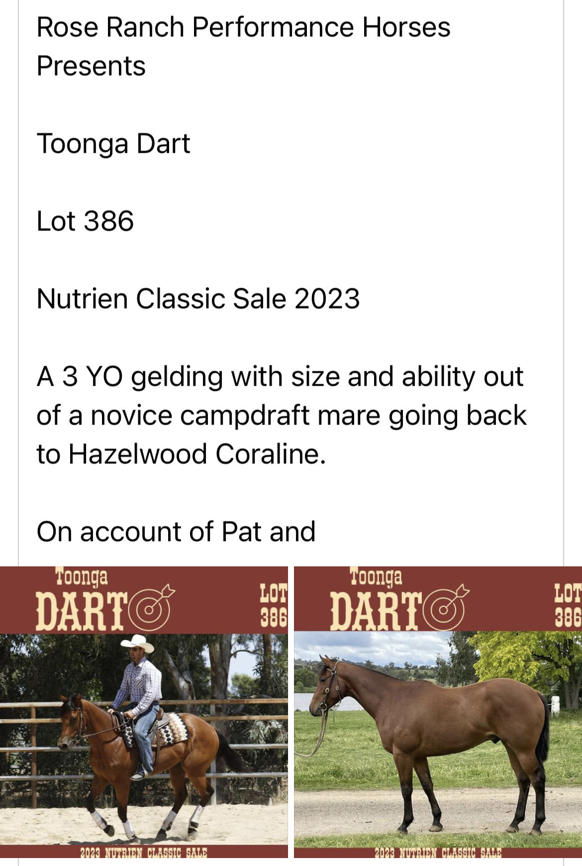 Toonga Dart is attractive 3 yo gelding who is in training with Warrick Pearsall. He will have had 3 months on cattle before the sale but would suit any discipline. His dam Two Darts is a Novice Campdrafter.