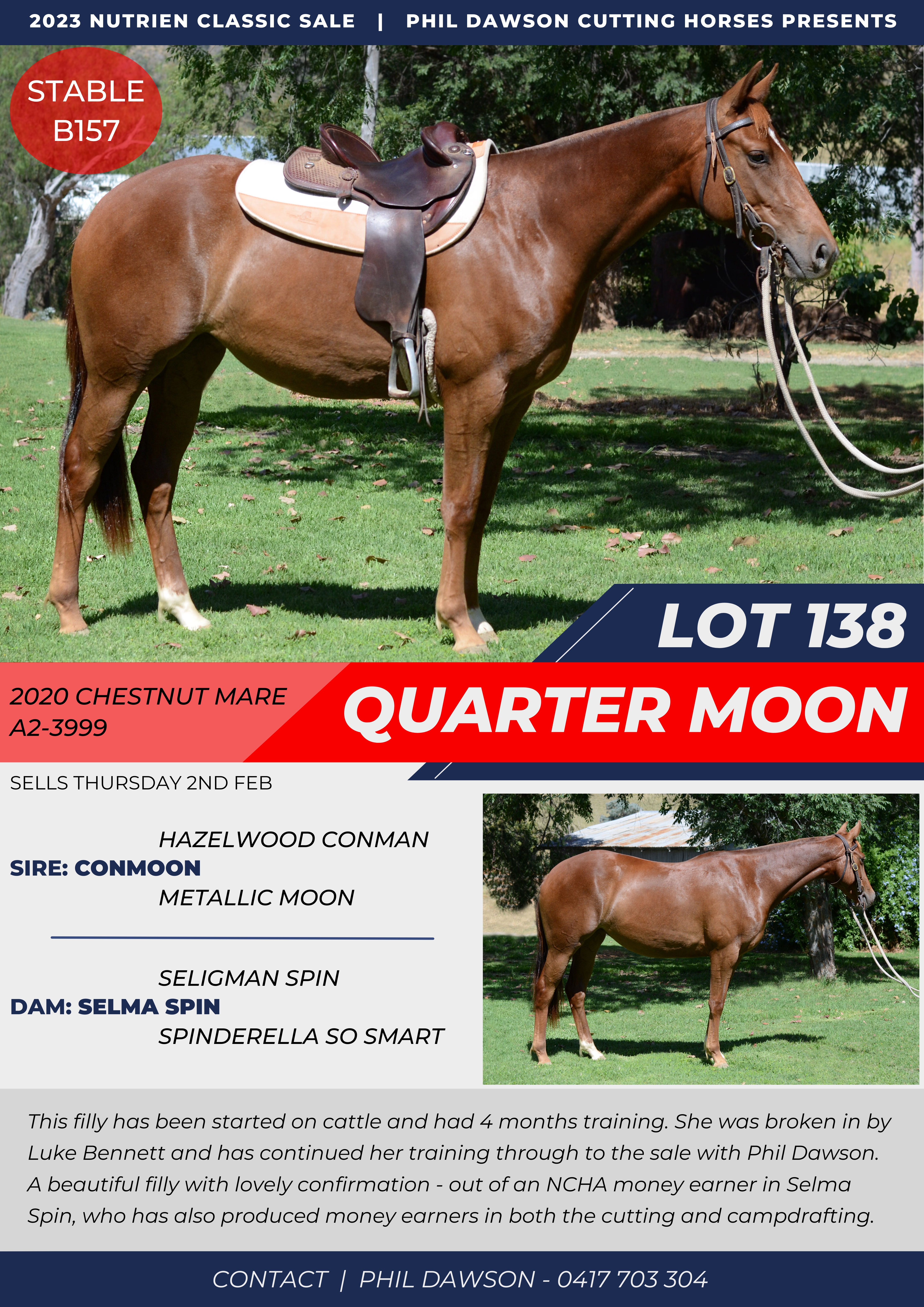 A beautiful filly with lovely confirmation, and out of an NCHA  money earner in Selma spin, who has also produced money earners in both the cutting and camp drafting.