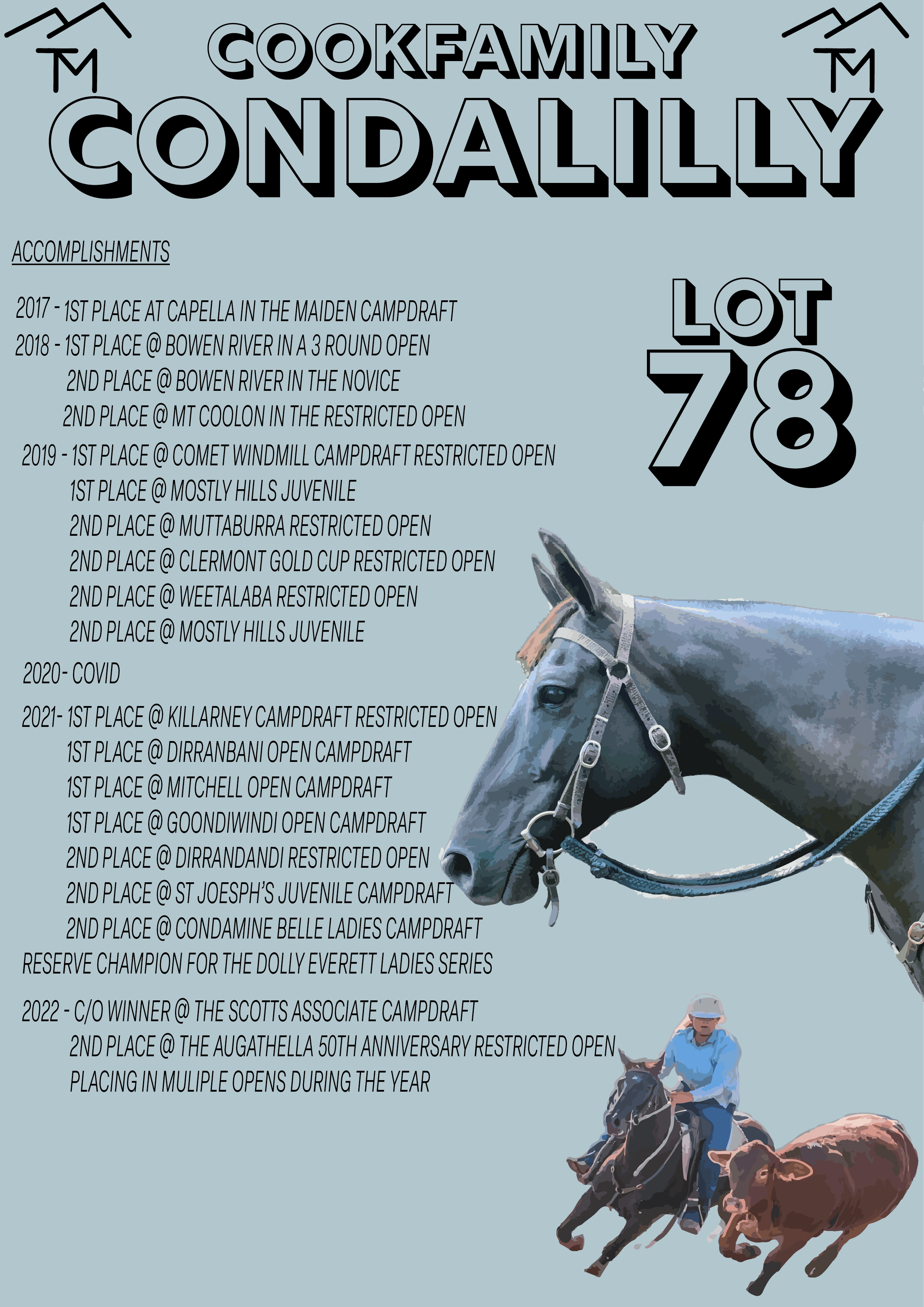 An elite, multiple open campdraft winning mare. She won her first Maiden as a 4 yr old. She has taken a 17 year old girl to 2nd place in the Dolly Everett Memorial Ladies Series in 2021, while also going into the Warwick Gold Cup final in the lead the same year. Condalilly is a full sister to Congressman. She is the winner of 6 open Campdrafts. She is an asset to any performance home to compete or breed. We are retaining 4 ET foals. STABLE CHANGE....... NEW STABLE B82