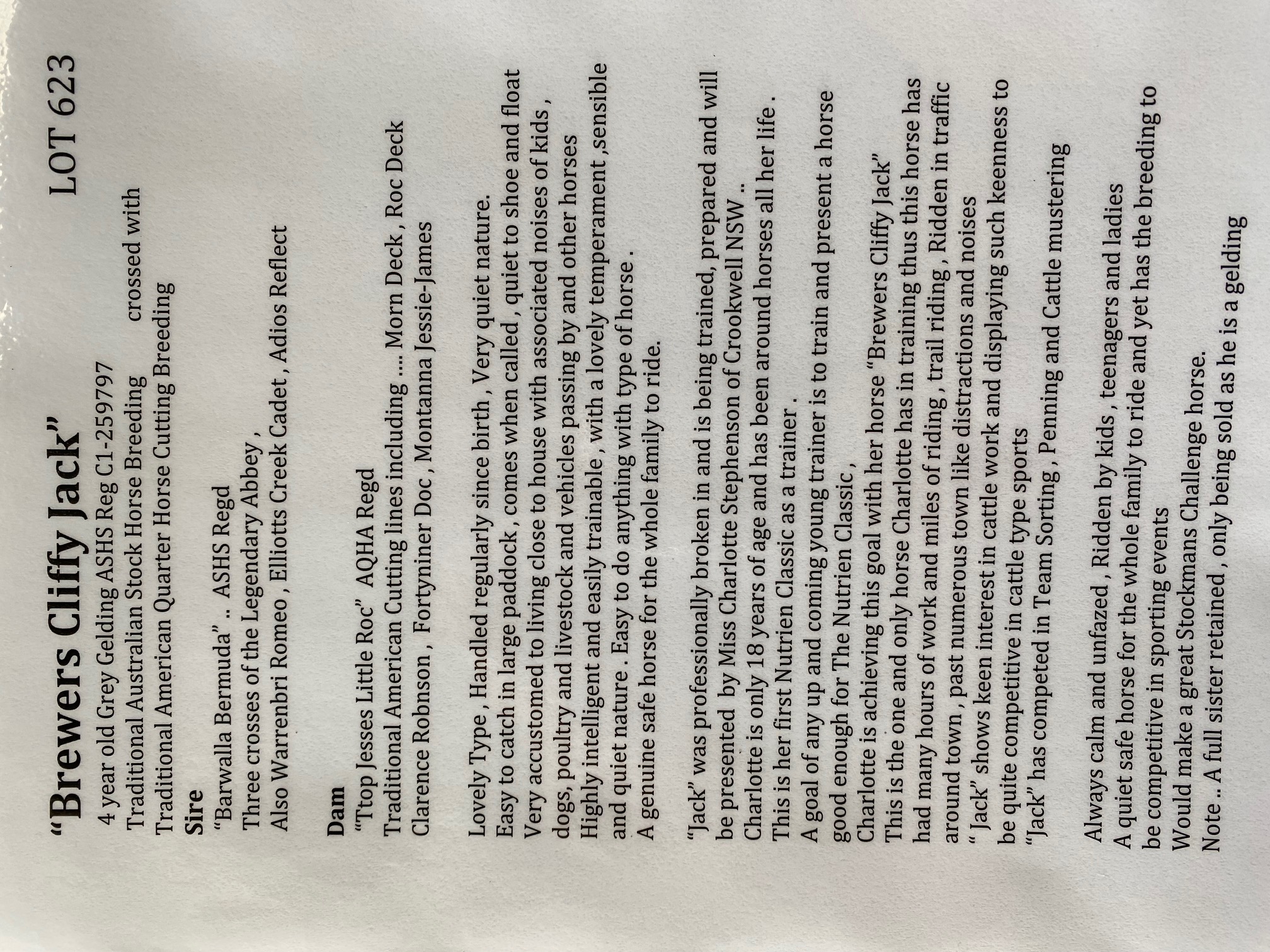 2018 Grey gelding by BARWALLA BERMUDA out of TTOP JESSES LITTLE ROC Very soft horse and willing to learn, great sense working with cattle and enjoys it been out and about and performs beautifully.
