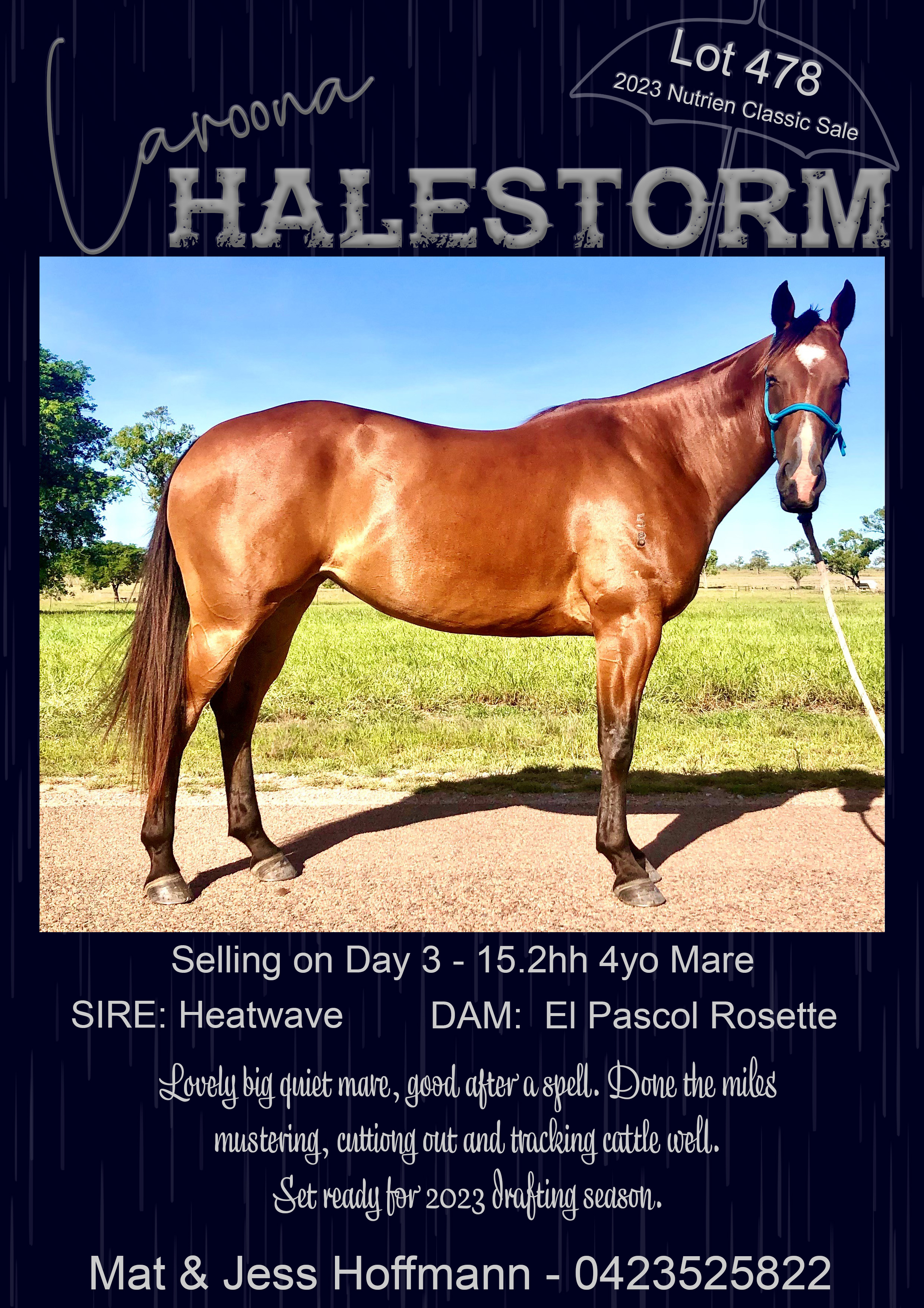Lovely big quite mare, good after spell , done miles of mustering, cutting out and tracking cattle well , set ready for the 2023 drafting season . 0423525822