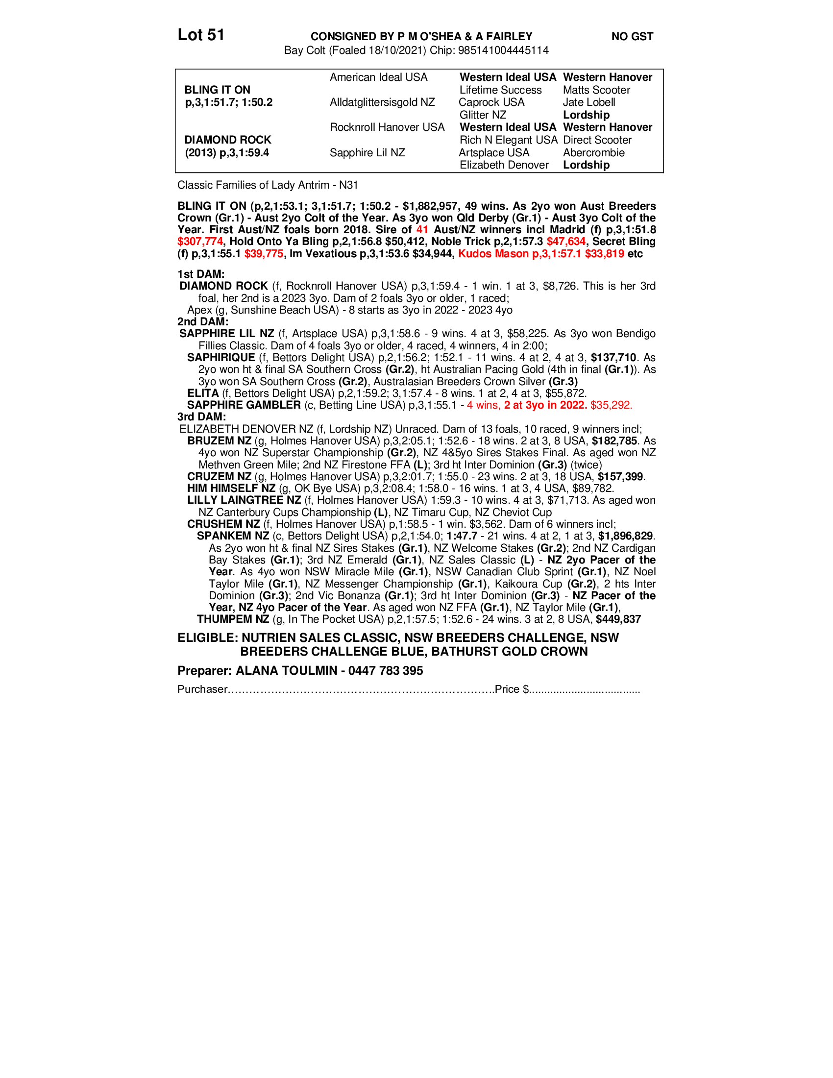 As previously noted, his dam was specifically purchased because she matched Bling It On, hence he has been linebred to give the buyer the best chance of racetrack success.