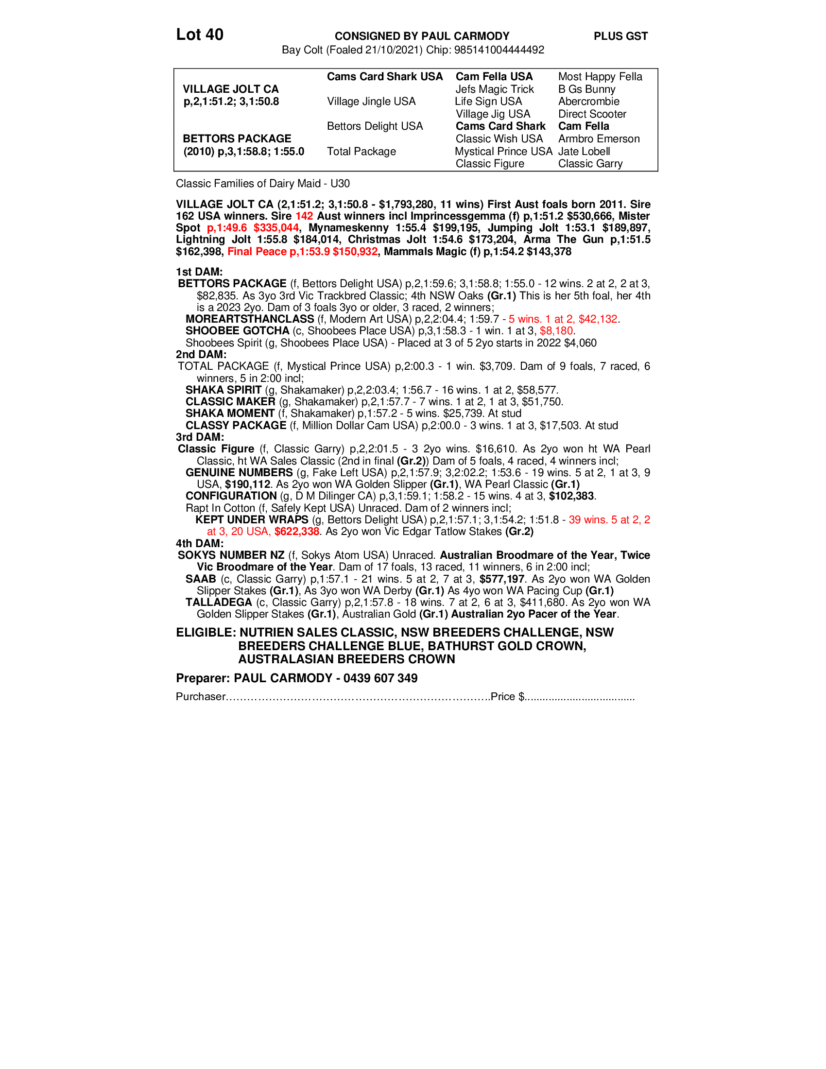 2021 COLT OUT OF BETTORS PACKAGE