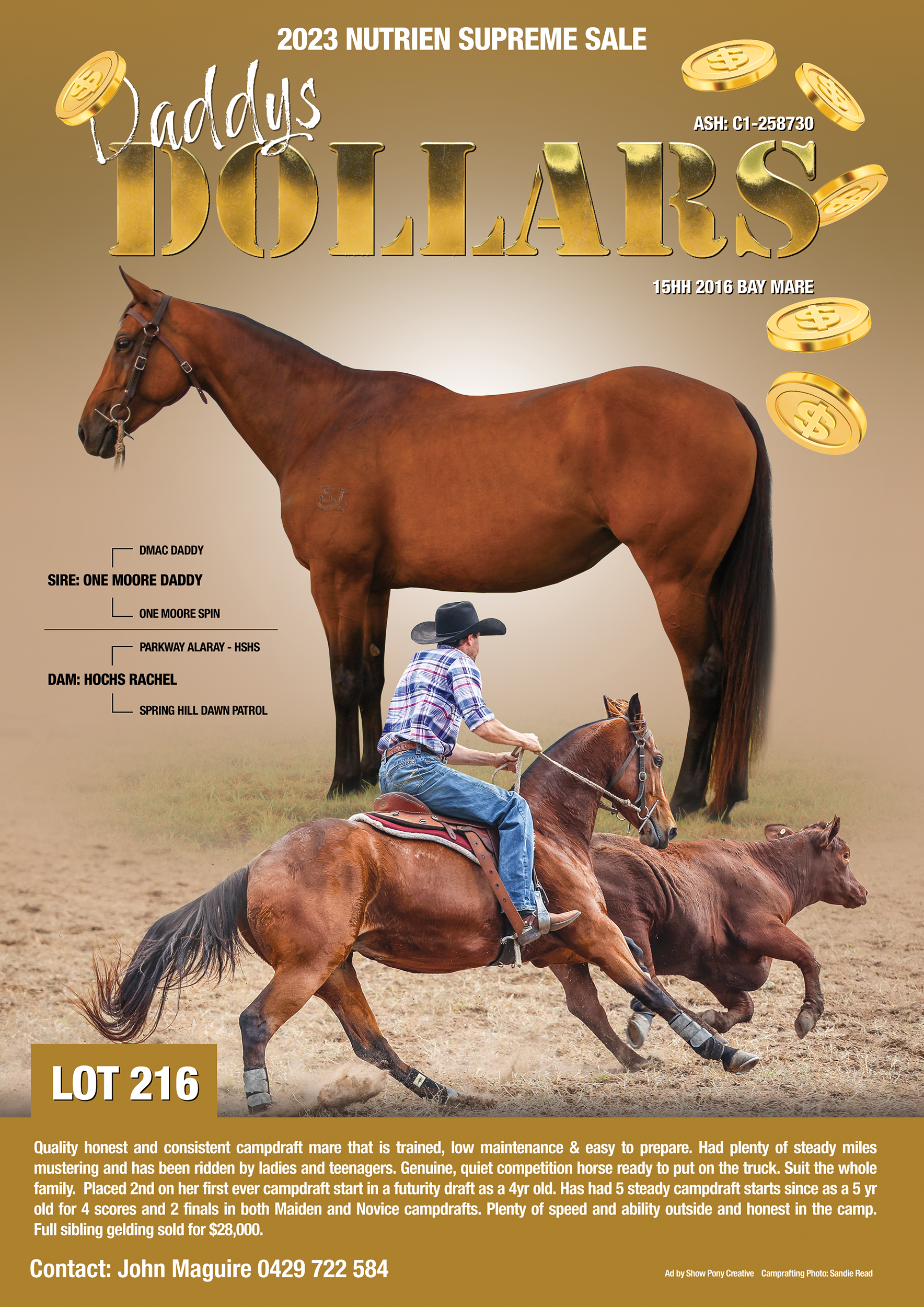 Placed 2nd on her first ever campdraft start in a futurity draft as a 4yr old. Has had 5 steady campdraft starts since as a 5 yr old for 4 scores and 2 finals in both maiden and novice drafts. Very honest and consistant One Moore Daddy mare with plenty of speed and ability outside, honest mare in the camp. Full sibling gelding sold for $28,000. Competitive mare ready to go. 0429722584