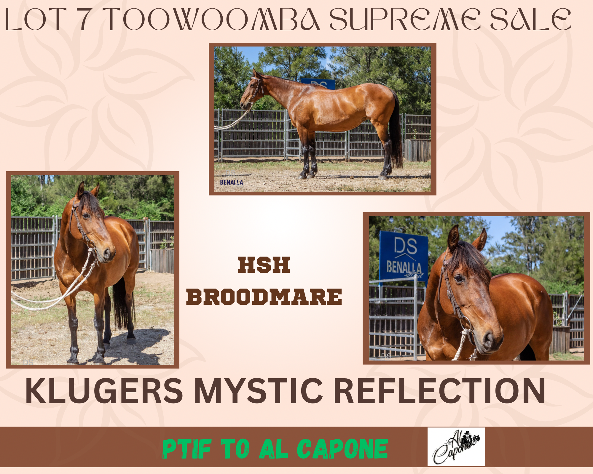 Mystic is a HSH mare who's had many campdraft placings, PTIF to Al Capone. Let her foal out and then bring her back in to compete. A 4mth old foal by Al Capone sold earlier this year for $9000.