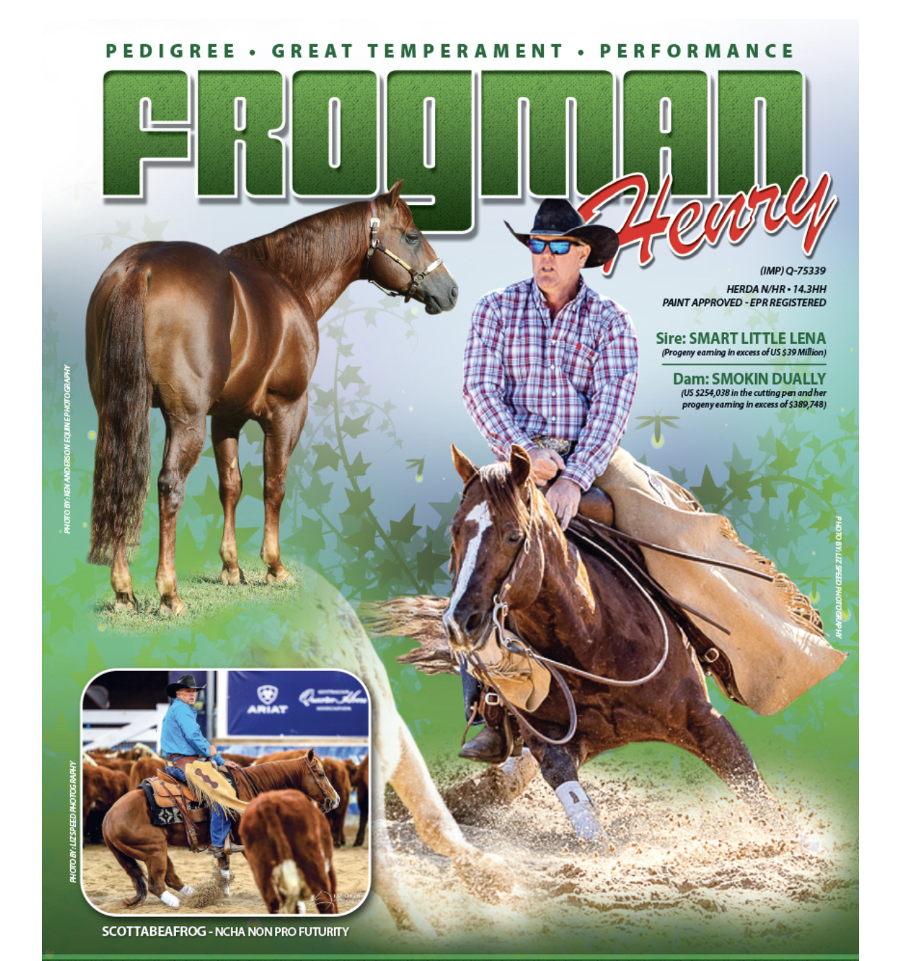 Stunning big filly and carrying a genetic cross of Smart Little Lena and HSH lines. She is bred perfectly to enter the campdraft/challenge arenas with valuable broodmare potential later on being an outcross for Highbrow Cat, Conman and Acres lines.