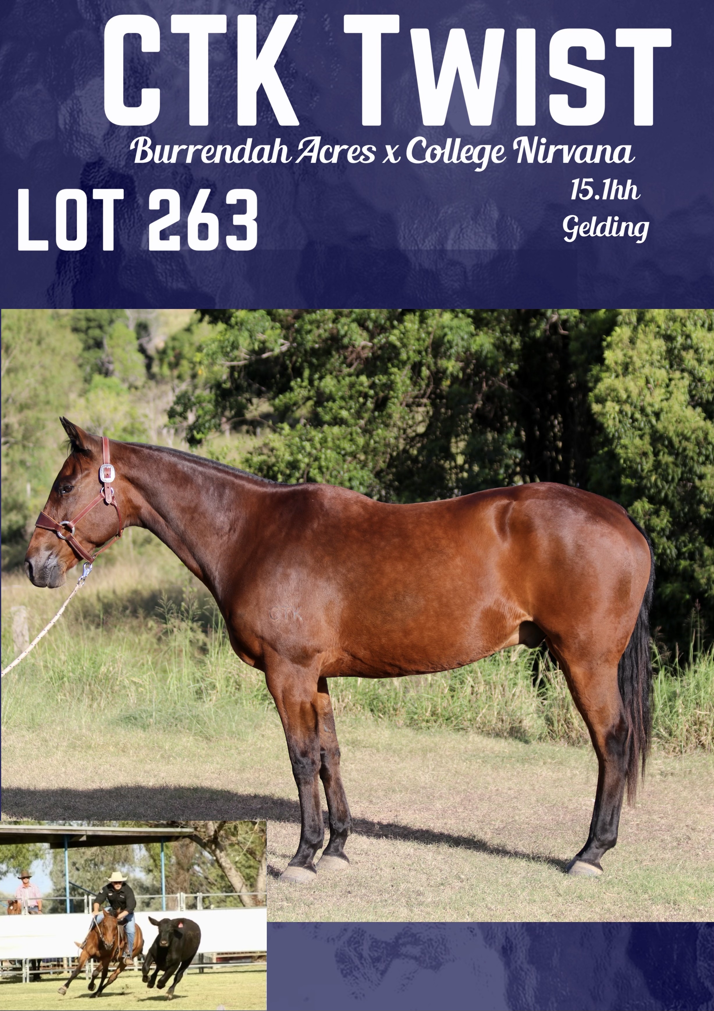 CTK TWIST is a big strong genuine gelding that has been lightly drafted with numerous placings. He has been ridden by teenage girls doing alot of mustering and is good to do anything with.