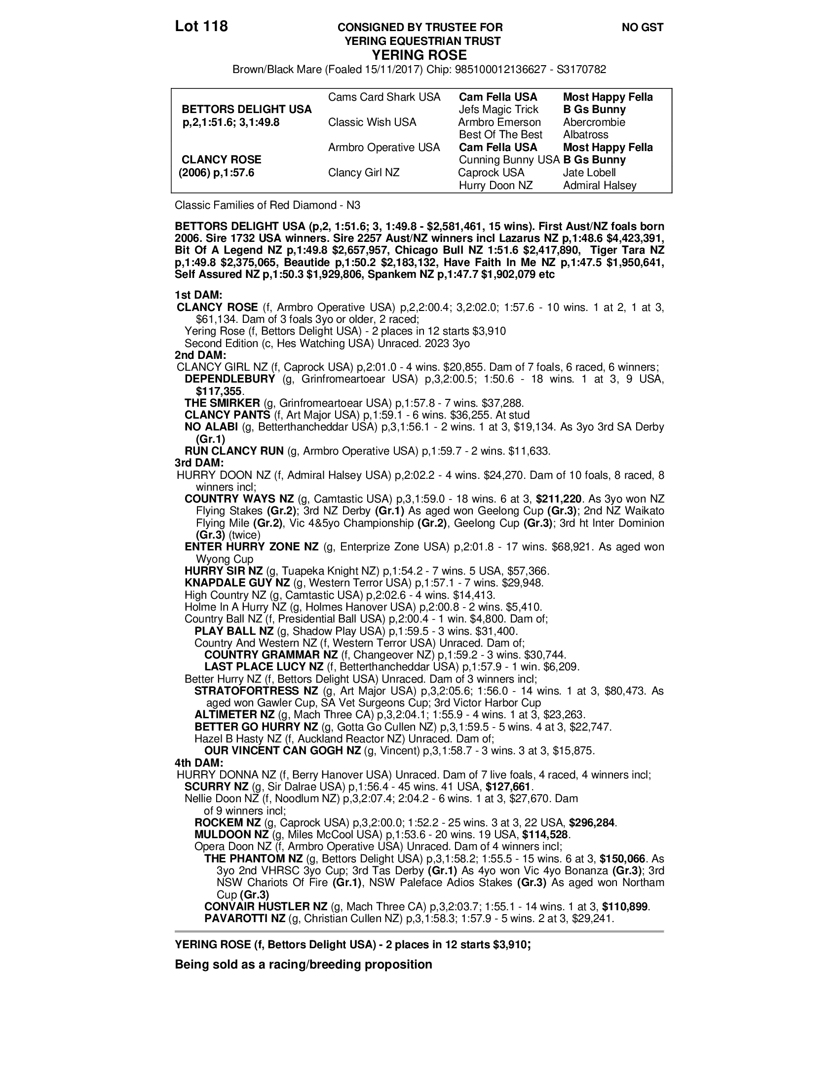 5yo Bettors Delight Mare. Injured Shoulder in paddock Accident as an early 3yo. 12 months off. Made it to races as a late 4yo chasing bonus and had 4 trials and 12 races in her first prep. Expect her to improve on a second race prep. Has been in paddock for 4 months. Still eligible for 50% Vicbred bonus. Perfect to race and then breed with a Bettors Mare.