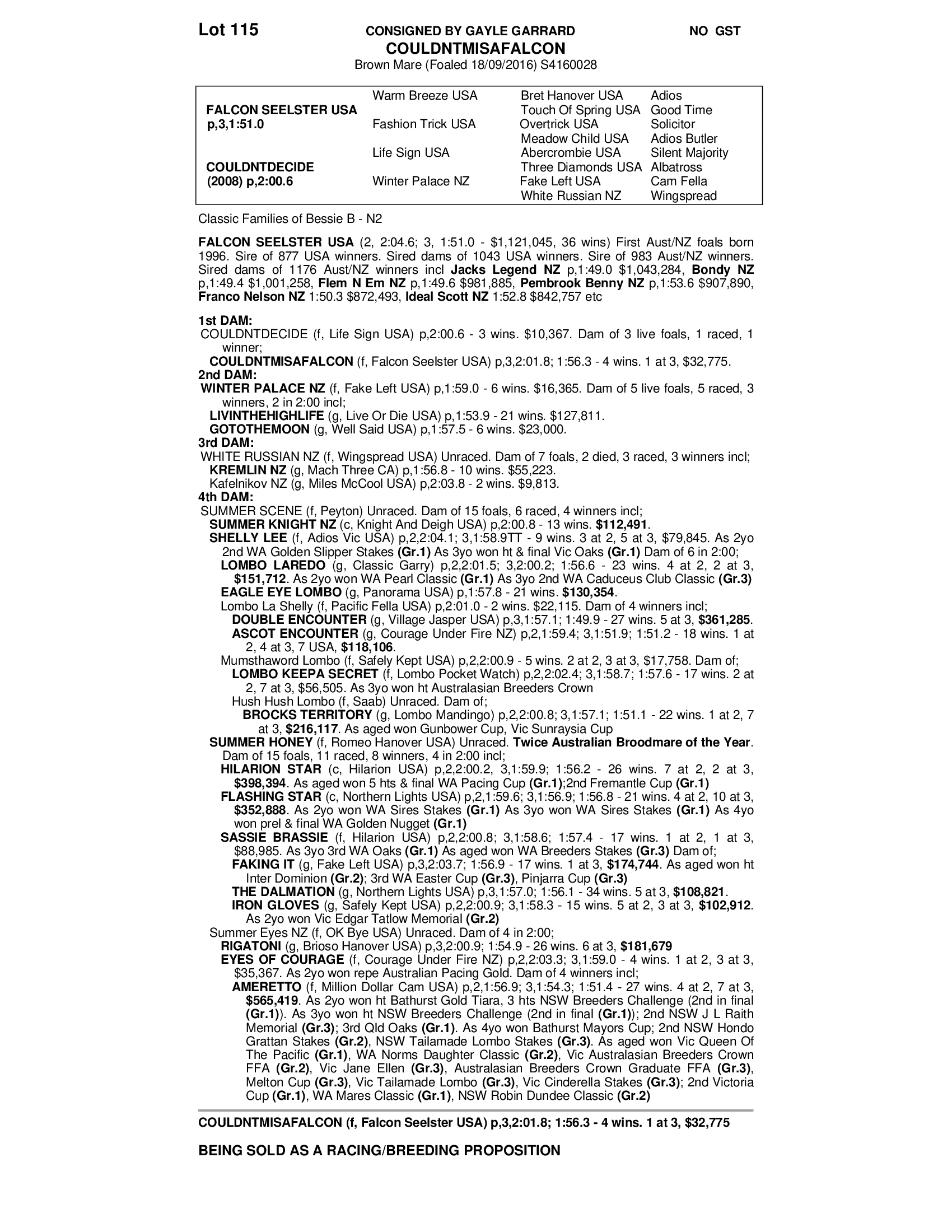 Currenlty racing. Sound mare with Good Ability, has raced and won freelegged. Doesn't wear a boot.