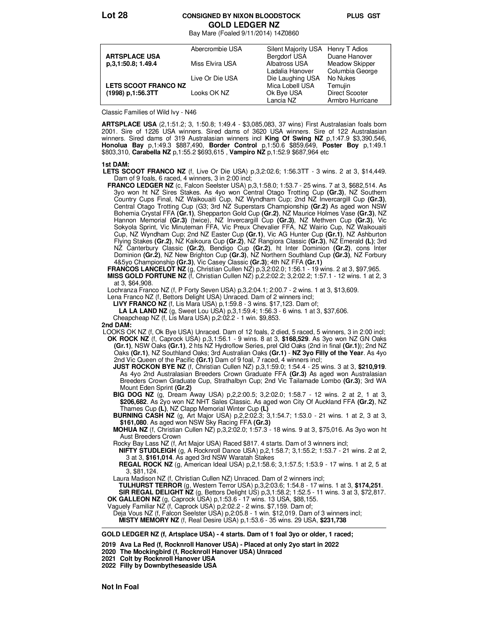 First foal, Ava La Red, placed at only start as a 2YO.  Second foal, The Mockingbird, qualified well in Jess Tubbs stable.  3rd foal, a colt purchased for $18,000 by Robbie Morris at this years Nutrien Yearling Sale.  Young Artsplace mares are very scarce and Goldy is a lovely type with a kind temperament.