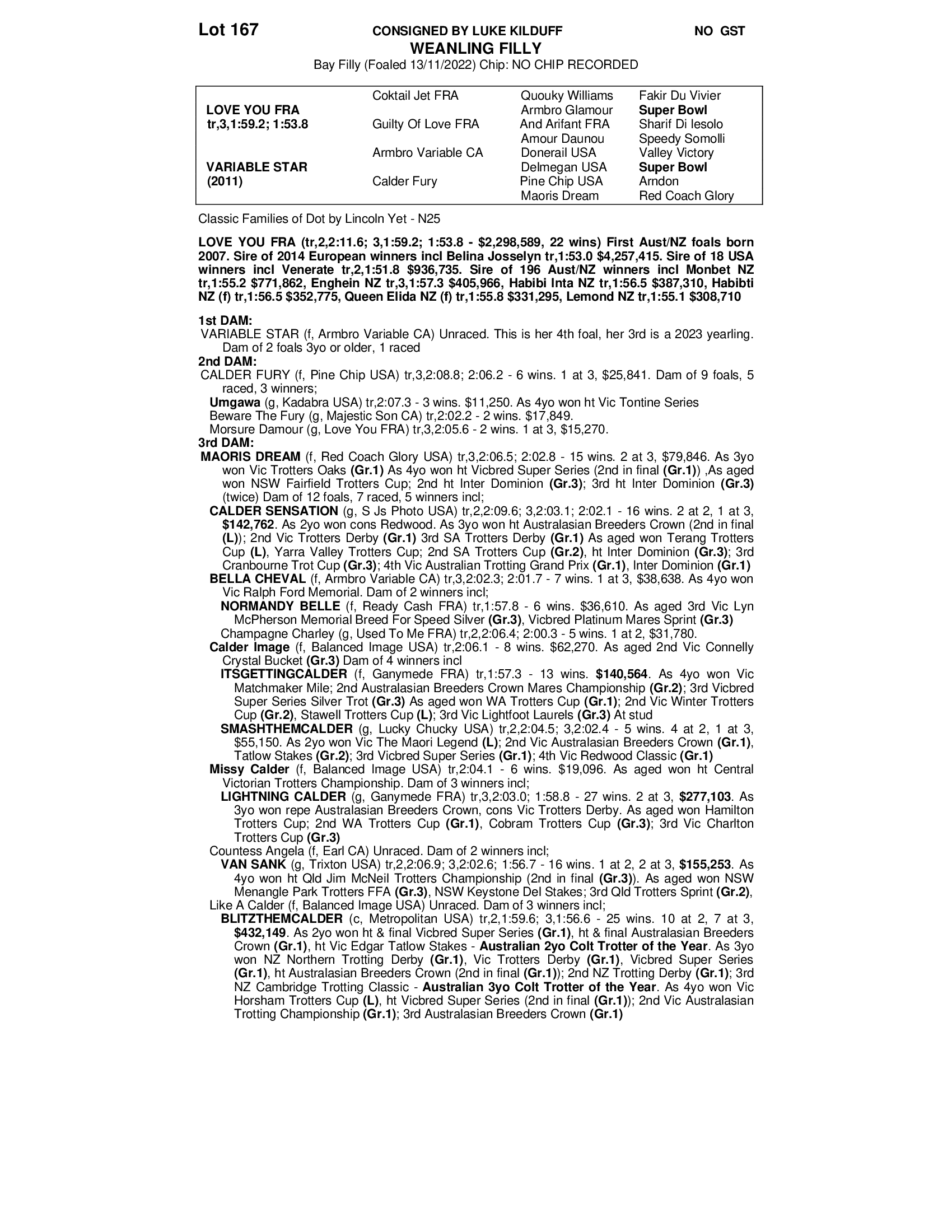BY LEADING SIRE WORLDWIDE LOVE YOU, RACE THEN BREED INTO BLACK TYPE FAMILY. FAMILY OF MAORIS IDOL.