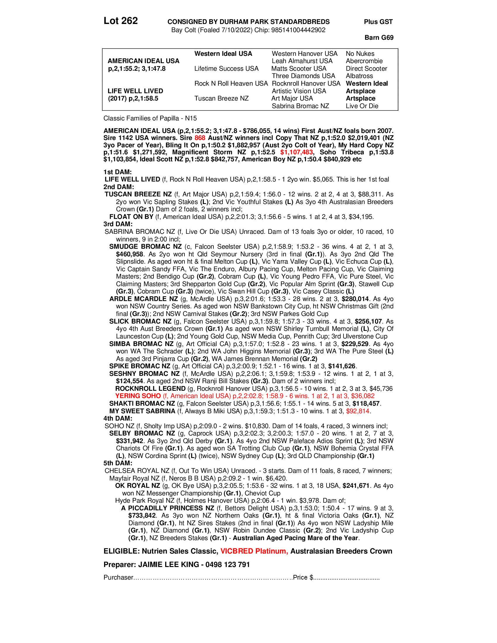 Dam showed enormous promise prior to injury as a 2YO. Grand Dam TUSCAN BREEZE NZ had 12 wins including the Sapling Stakes, and is a daughter of SABRINA BROMAC NZ, 10 raced for 10 winners, with a total of 172 wins for $1,702,559, including SMUDGE BROMAC, 36 wins, $460,958, ARDLE MCARDLE, 28 wins, $280,014, SLICK BROMAC, 33 wins, $256,107, SIMBA BROMAC, 23 wins, $229,529, SPIKE BROMAC, 16 wins, $141,626, SESNEY BROMAC, 12 wins, $124,554, SHATKI BROMAC, 14 wins, $118,457 and MY SWEET SABRINA, 10 wins, $91,314.