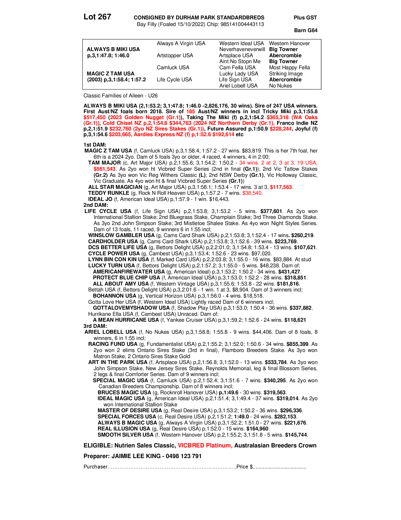 Out of imported CAMLUCK mare MAGIC Z TAM USA, who has produced 4 to race for 4 winners, including GRP1 winner TAM MAJOR, 27 wins, $501,593 and ALL STAR MAGICIAN, 17 wins, $116,791. Very successful US family, with the Grand Dam, LIFE CYCLE producing 11 to race for 9 winners, and her dam ARIEL LOBELL producing 8 to race for 8 winners.
