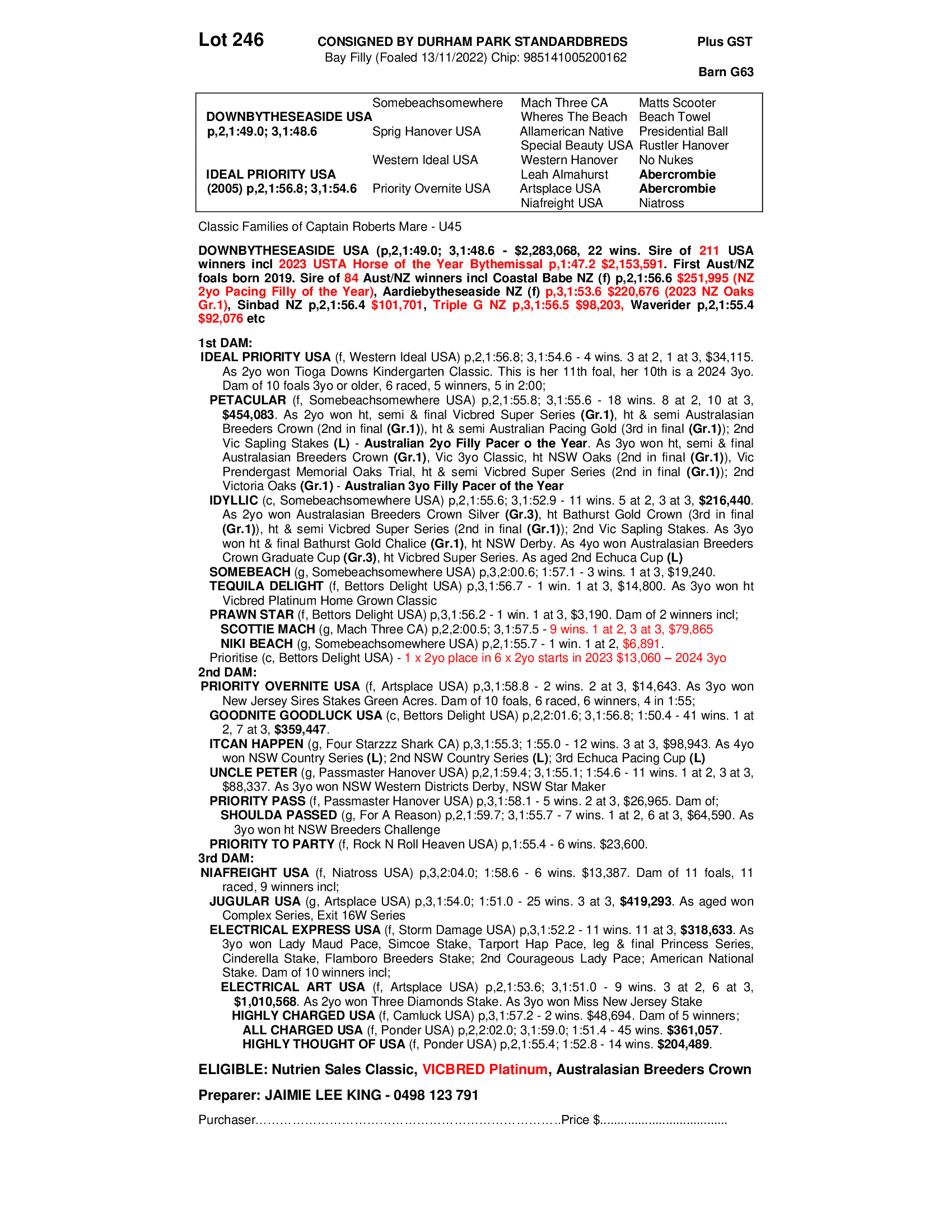 Imported dam, IDEAL PRIORITY USA, 1:54.6, by WESTERN IDEAL, out of ARTSPLACE mare PRIORITY OVERNIGHT. She has had 6 to race for 5 winners, including GRP1 winners, 2YO & 3YO Australian Filly Of The Year, PETACULAR, 1:55.6, 18 wins, $454,083, and IDYLLIC, 1:52.9, 11 wins, $216,440.