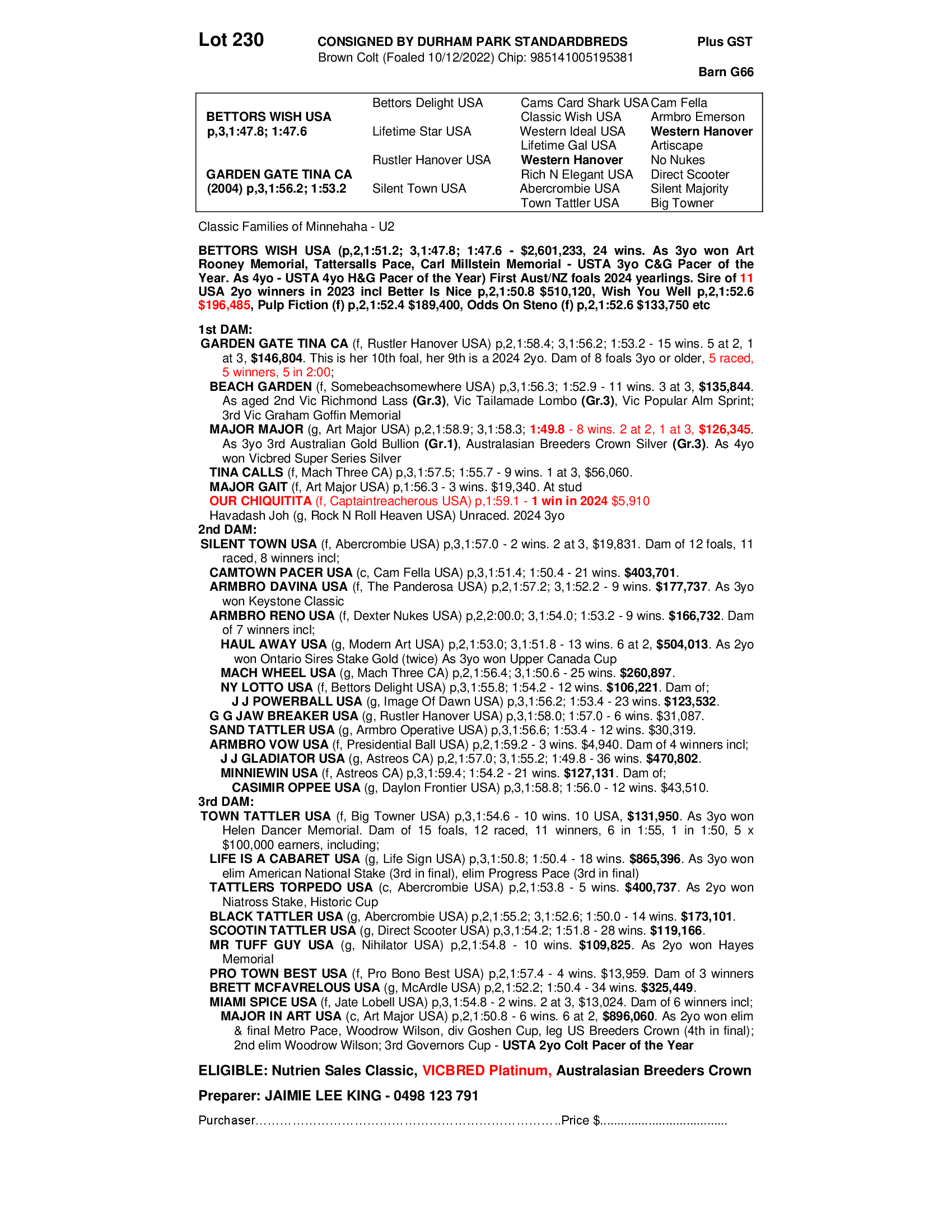 Dam GARDEN GATE TINA CA, 1:52.9, 11 wins for $135,844, has 5 to race for 5 winners, including 2, $100,000 plus winners, and is from an outstanding Canadian family, with her dam SILENT TOWN producing 8 winners including 3, $150,000 plus winners and her second dam TOWN TATTLER, produced 11 winners from 12 to race, including 6, $100,000 plus winners.