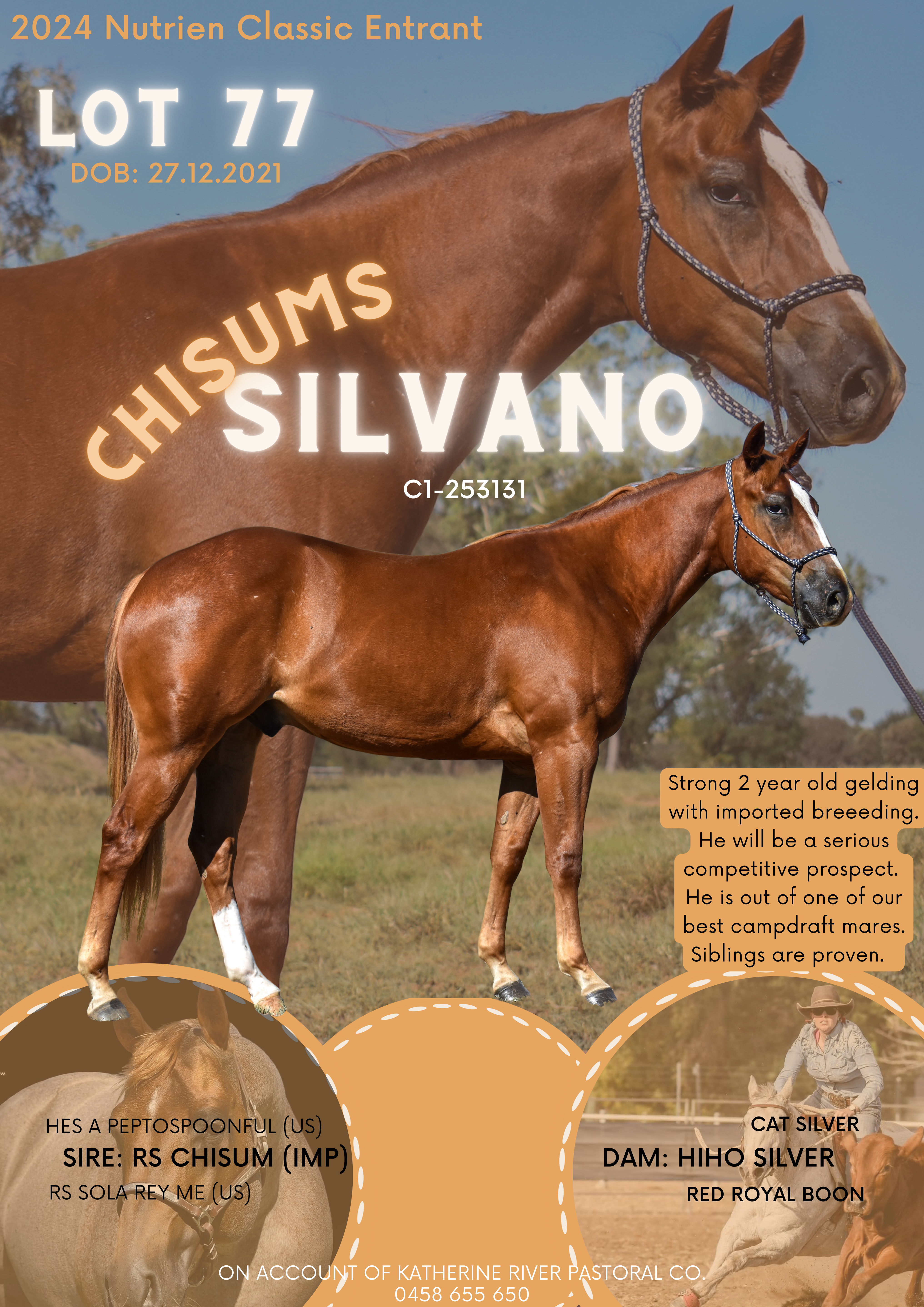 Beautiful gelding out of one our best campdraft mares. His full brother is a campdraft winner. Great prospect for cutting, campdrafting & challenging. This gelding is showing great potential, he is well put together and that has a quiet nature that you can do anything with. He has a big stop and turn, he is very athletic. He is all the things that we admire in a young horse.