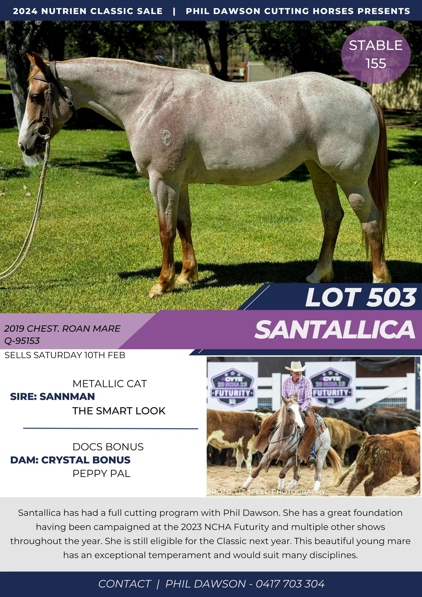 Santallica is currently in a full professional cutting program with Phil Dawson Phil has shown her in 2023 Tamworth futurity and numerous other shows throughout 2023 . Beautiful young mare would suit multiple disciplines